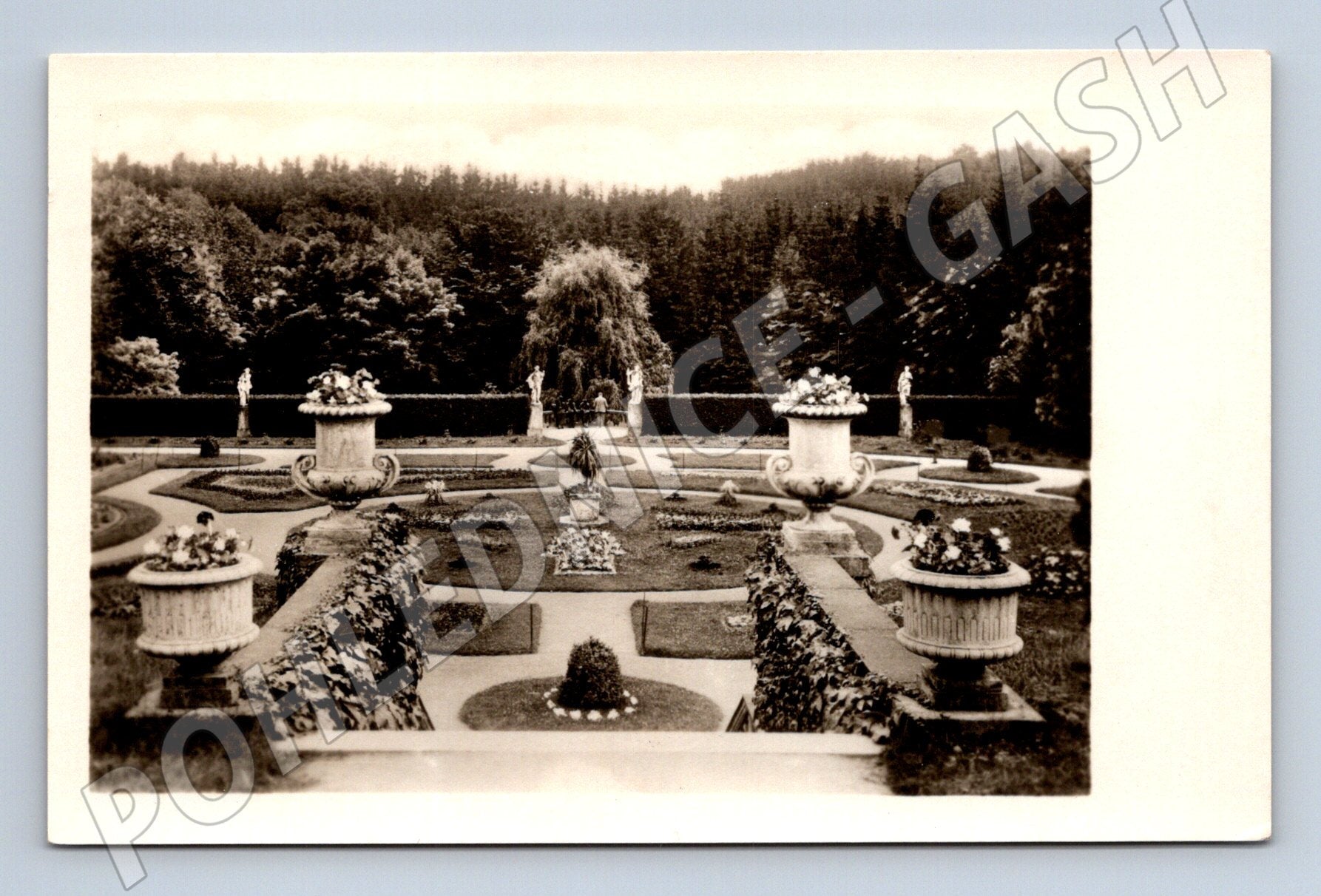 Originální stará pohlednice s motivem zámecké zahrady zámku Konopiště. Na přední straně je vyobrazen elegantní park s květinovou výzdobou, fontánami a sochami, v pozadí les. Pohlednice je neprošlá, na zadní straně je označení Konopiště , bez věnování. Jedná se o klasický sběratelský kousek vhodný pro milovníky hradů, zámků a historických parků. Celkový stav odpovídá stáří, viz foto.
