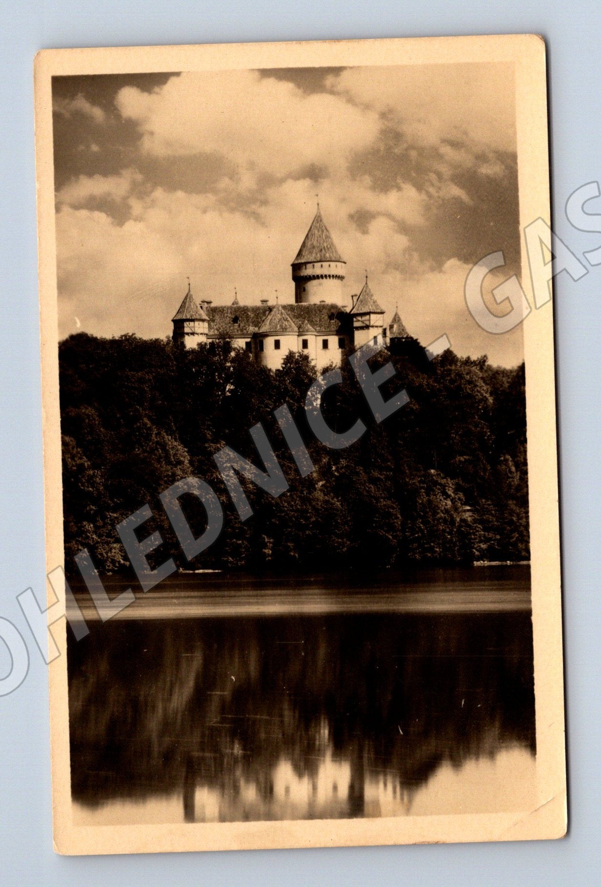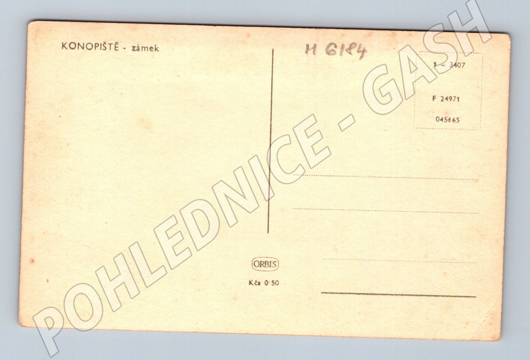 Originální černobílá pohlednice s motivem známého zámku Konopiště, situovaného v zeleni nad hladinou rybníka. Pohlednice nebyla prošla poštou, na zadní straně je uvedeno KONOPIŠTĚ - zámek , tisk Orbis, cena Kč 0:50. Celkově velmi dobrý stav, pouze drobné stopy stáří a opotřebení. Vhodné pro sběratele pohlednic s tématikou českých památek a hradů.