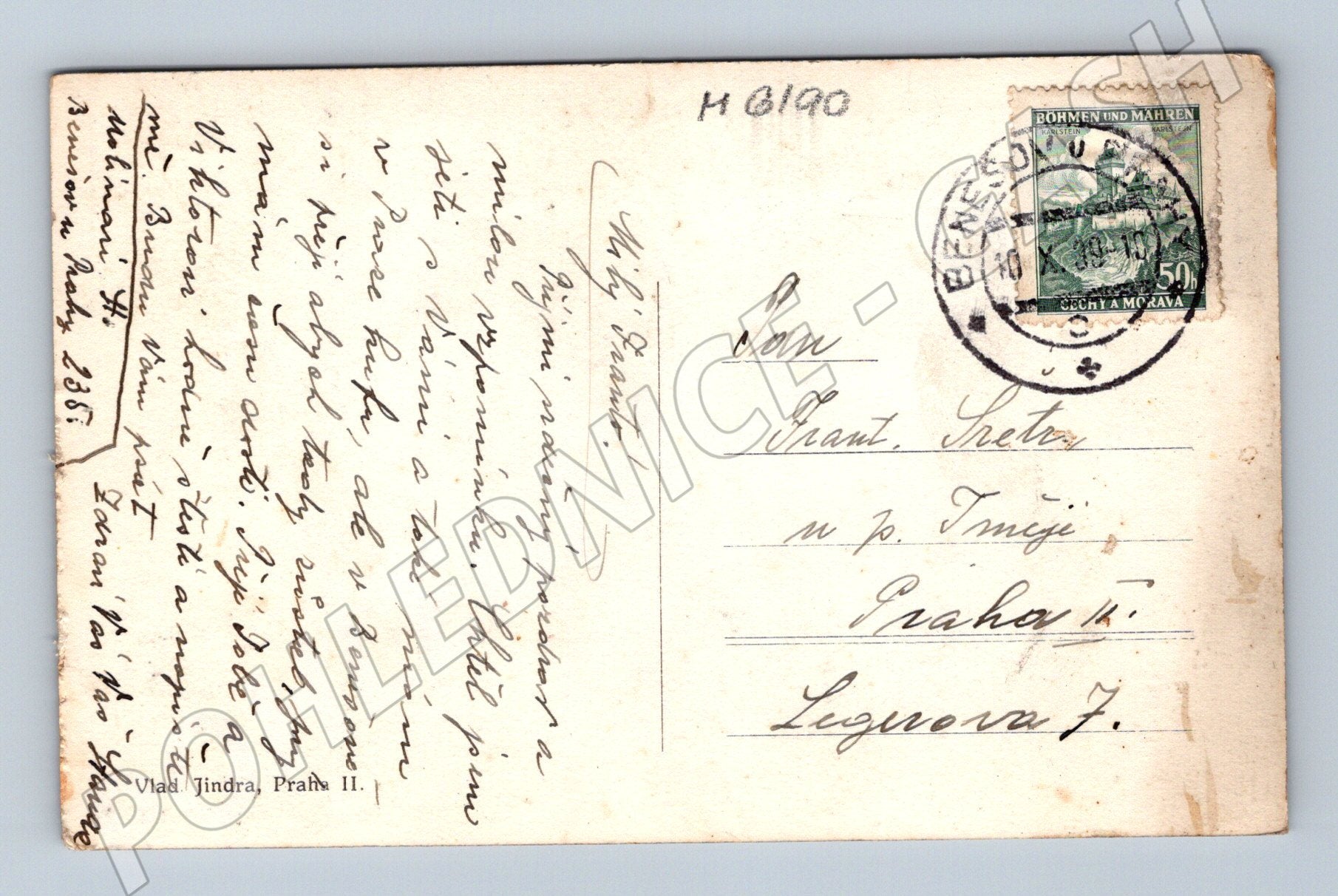 Starší černobílá pohlednice s motivem zámku Konopiště, známého historického sídla na Benešovsku. Na přední straně je zámek s odrazem na hladině rybníka, orámovaný siluetami stromů. Pohlednice byla odeslaná, na zadní straně je ručně psané věnování, známka a razítko Benešov. Vydavatel Vlad. Jindra, Praha II. Pohlednice nese známky stáří i používání (otřepy na okrajích, drobné flíčky). Zajímavý sběratelský kousek z období Protektorátu Čechy a Morava.