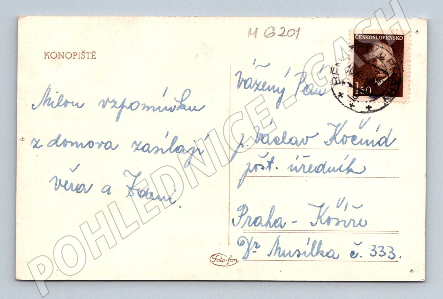 Originální stará pohlednice s motivem zámku Konopiště. Pohlednice je černobílá, zachycuje zámek Konopiště v dobové krajině s bohatou vegetací. Na zadní straně je ručně psaný vzkaz, adresa a známka z období Československa. Stav pohlednice odpovídá stáří, menší opotřebení rohů, viz scan. Jedná se o sběratelsky zajímavý kousek, vhodný do sbírky pohlednic s motivem hradů a zámků nebo historických pohlednic z ČR.