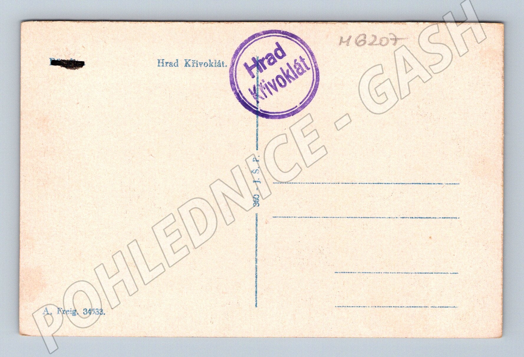 Originální stará pohlednice s motivem hradu Křivoklát. Na pohlednici je vyobrazen celkový pohled na jeden z nejstarších a nejvýznamnějších českých hradů, nacházející se ve Středočeském kraji. Pohlednice je černobílá a byla vydána firmou A. Freig, číslo 34533. Na zadní straně je modrý potisk s názvem Hrad Křivoklát , doplněný také razítkem. Pohlednice je neprošlá poštou a ve velmi pěkném stavu. Vhodné pro sběratele historických a tématických pohlednic, zejména zájemce o české hrady.