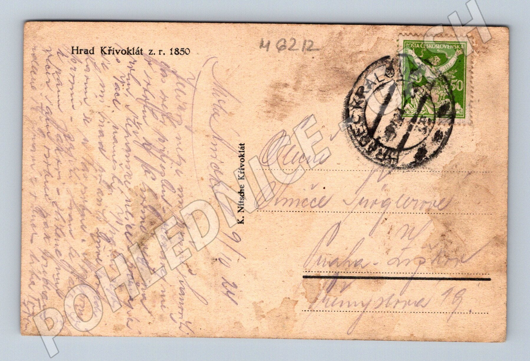 Starobylá pohlednice zachycující hrad Křivoklát v provedení z roku 1850 od K. Nitsche. Na přední straně je krásně vyvedená kresba hradu zasazeného v malebné krajině, kde jsou patrné i dobové postavy a okolní lesy. Zadní strana je popsána, pohlednice byla odeslána a je opatřena poštovní známkou z období Československa. Jedná se o sběratelsky velmi atraktivní kus pro milovníky historických pohlednic, hradů a české historie. Rozměry odpovídají dobovému standardu, celkový stav odpovídá stáří, místy známky opotřebení či zašpinění, ale bez výrazného poškození.