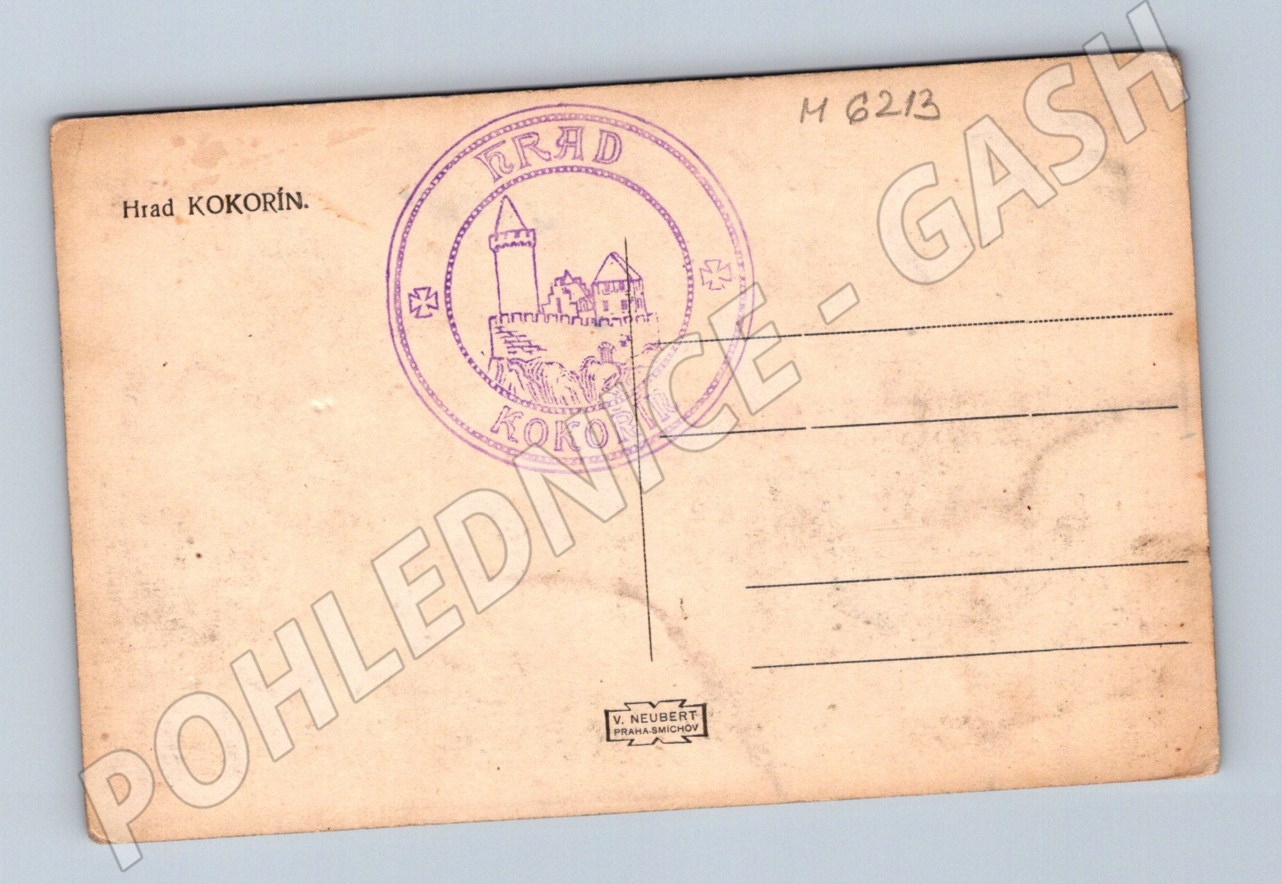Nabízím originální starou pohlednici s vyobrazením hradu Kokořín. Pohlednice zachycuje ikonický pohled na hrad stojící uprostřed lesů, s viditelnou zdaleka rozpoznatelnou věží a hradbami. Na zadní straně je fialové razítko s textem Hrad Kokořín a odpovídajícím vyobrazením hradu. Vydavatel: V. Neubert, Smíchov. Pohlednice je ve velmi pěkném sběratelském stavu, místy drobné známky stáří a opotřebení. Skvělý kousek do sbírky historických pohlednic českých hradů.