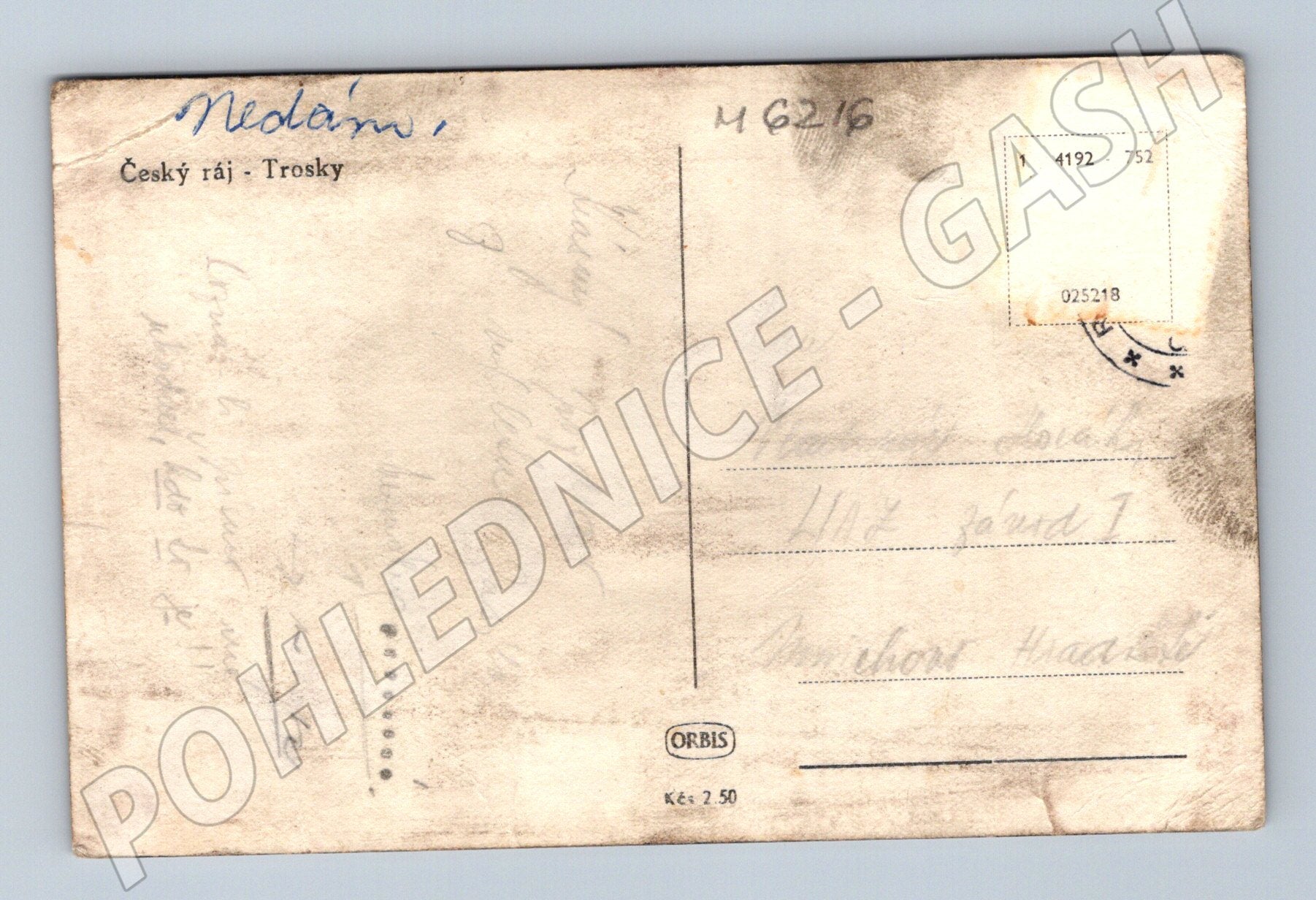 Starší černobílá pohlednice zachycující hrad Trosky v Českém ráji. Na přední straně je ikonický pohled na charakteristické dvě věže hradu a přilehlou krajinu s vesnickými staveními. Zadní strana obsahuje původní popis „Český ráj - Trosky“, ručně psaný text, známku a razítko. Pohlednice nese známky stáří, ohlé rohy a menší flíčky. Vhodné pro sběratele českých historických pohlednic a milovníky památek.