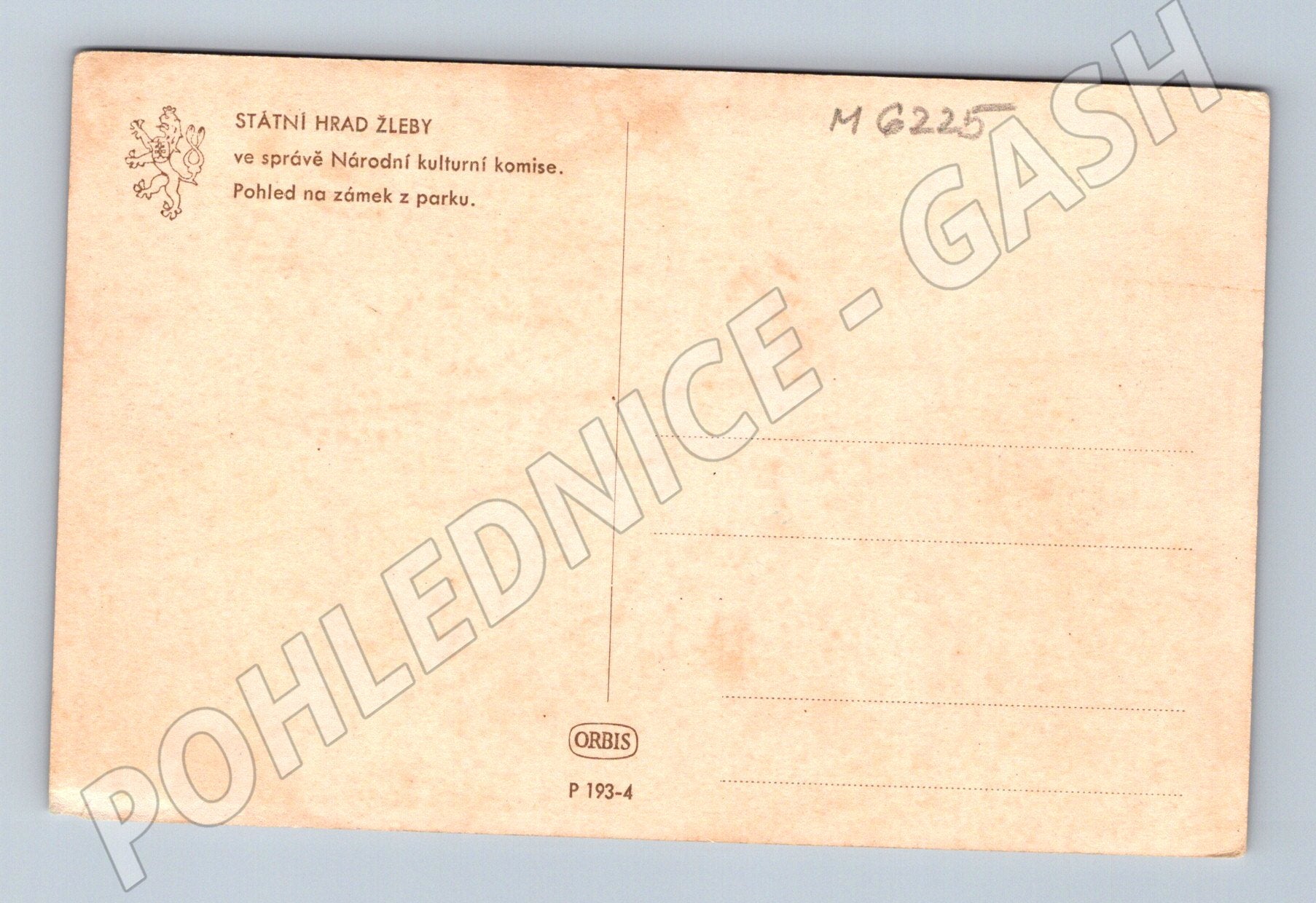 Starší pohlednice státního hradu Žleby ve správě Národní kulturní komise. Na fotografii je pohled na zámek z parku, typická architektura s věží, stromy v popředí. Pohlednice není popsána ani použita, zachovalý stav, patina odpovídající stáří. Na zadní straně tisk STÁTNÍ HRAD ŽLEBY ve správě Národní kulturní komise. Pohled na zámek z parku. a logo vydavatele ORBIS. Formát menší, černobílá fotografie. Vhodné pro sběratele historických pohlednic, památek nebo milovníky architektury českých hradů a zámků.