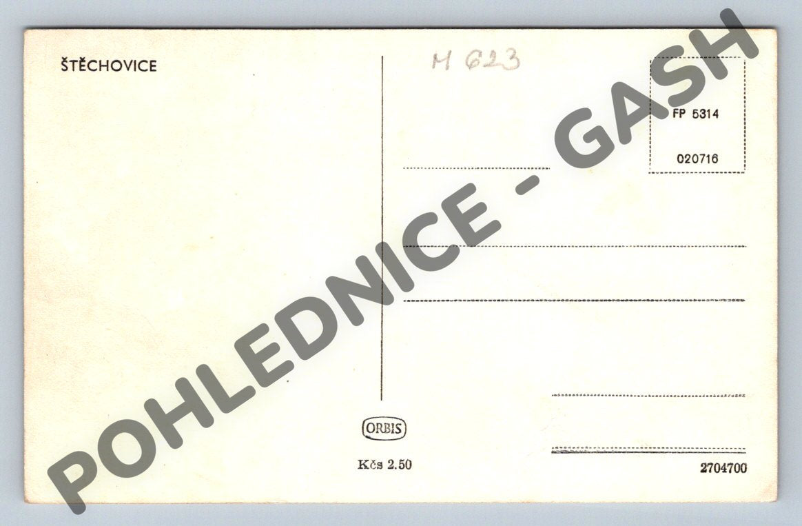 Černobílá pohlednice zobrazující parník T.G. Masaryk přistávající u břehu v nádherné přírodní kulise Štěchovic. Parník je na vodní hladině vedle budov a stromového porostu na svahu kopce v pozadí. Pohlednice je zachovalá, bez nápisů a razítek na přední straně, na zadní straně je vytištěn název místa ŠTĚCHOVICE a výrobní značka ORBIS s cenou 2,50 Kčs. Ideální kus pro sběratele pohlednic zaměřených na vodní dopravu a historické lodě v Československu.