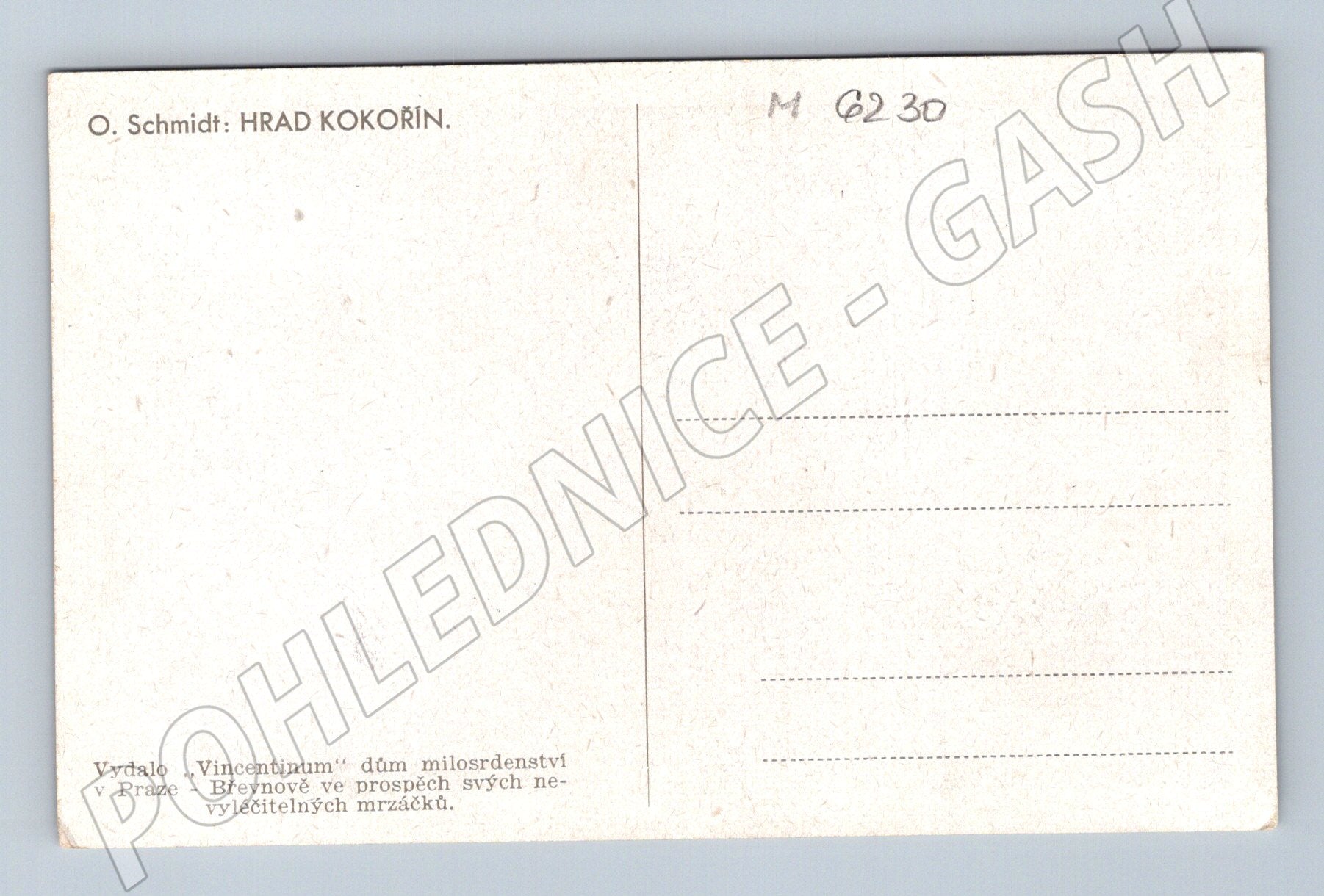 Originální historická pohlednice zachycující malířské ztvárnění hradu Kokořín, autorem je O. Schmidt. Pohlednice je neprošlá poštou a na zadní straně je uvedeno, že byla vydána Vincentinum, dům milosrdenství v Praze – Břevnově, ve prospěch nevyléčitelně nemocných dětí. Stav velmi dobrý, pouze drobné známky stáří, viz foto. Vhodné pro sběratele pohlednic s motivy českých hradů a zámků nebo milovníky historie a umění.