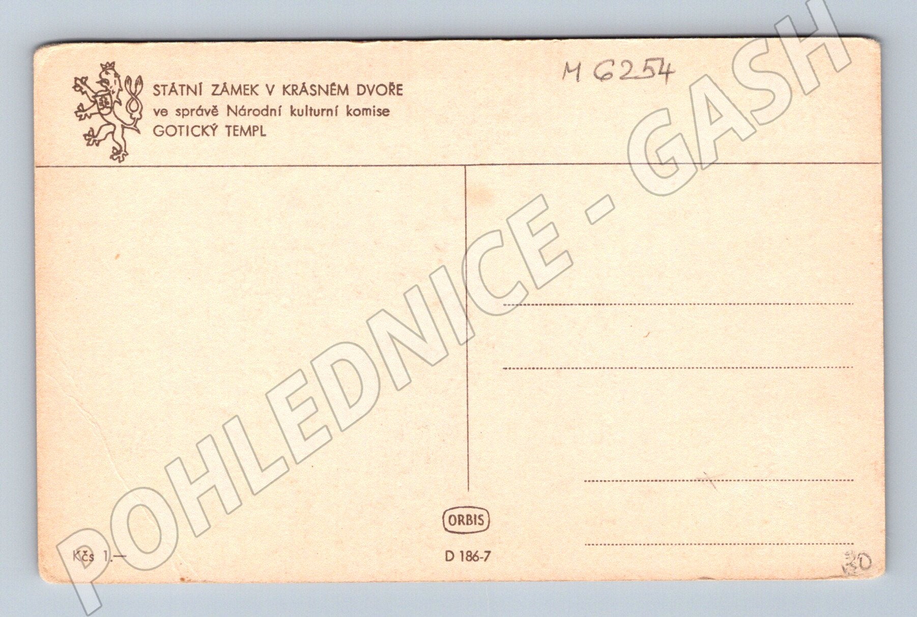 Originální černobílá pohlednice zobrazující gotický templ v parku státního zámku v Krásném Dvoře. Pohlednice pochází z období Československa, vydavatel Orbis, evidenční číslo D 186-7. Pohlednice je nepopsaná a v dobrém sběratelském stavu, s drobnými známkami stáří na okrajích. Na rubu je vytištěn nápis: STÁTNÍ ZÁMEK V KRÁSNÉM DVOŘE, ve správě Národní kulturní komise, GOTICKÝ TEMPL. Atraktivní kousek pro sběratele historických pohlednic a milovníky architektury a památek.