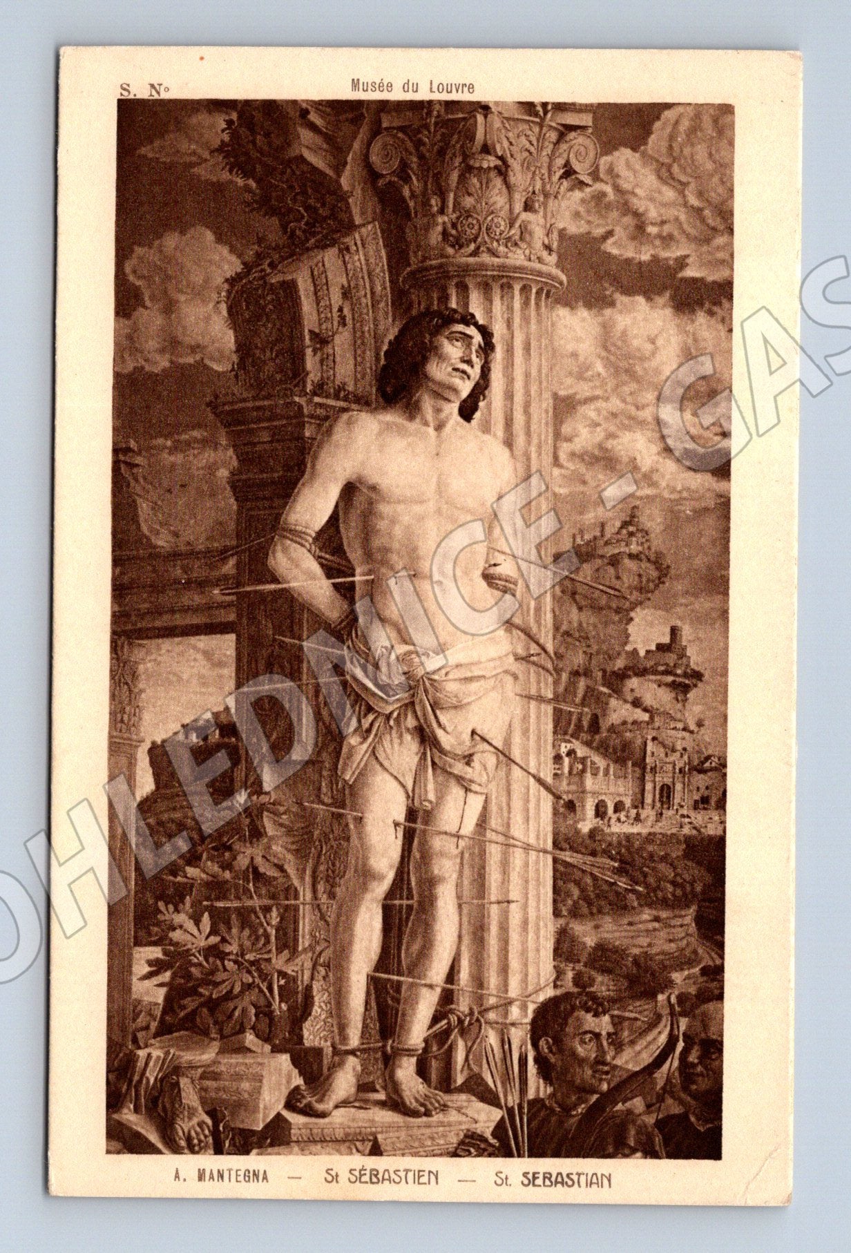 Starobylá pohlednice s reprodukcí slavného obrazu sv. Šebestiána od Andrey Mantegny, umístěného v Louvru. Kresba zachycuje scéna sv. Šebestiána přivázaného ke sloupu a probodnutého šípy, s bohatým antickým pozadím a výrazným zpracováním detailu. Pohlednice je ve velmi dobrém stavu, neprošlá poštou, s označením CARTE POSTALE na zadní straně. Vhodné pro sběratele tematických nebo uměleckých pohlednic, i jako dekorativní prvek.