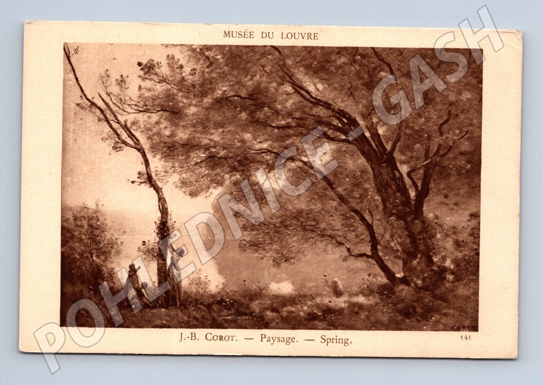 Originální stará pohlednice s reprodukcí obrazu J.-B. Corota Paysage – Spring vystaveného v Musée du Louvre. Pohlednice je v krásném sepia tónu, neprošlá poštou, čistá a ve velmi dobrém stavu. Na přední straně se nachází umělecký motiv krajiny s postavami pod stromy v jarní krajině, typické pro Corotovu jemnou práci se světlem a atmosférou. Zadní strana je určená pro adresu a zprávu, bez známky či razítka. Vhodné pro sběratele umění či pohlednic s malířskou tématikou.