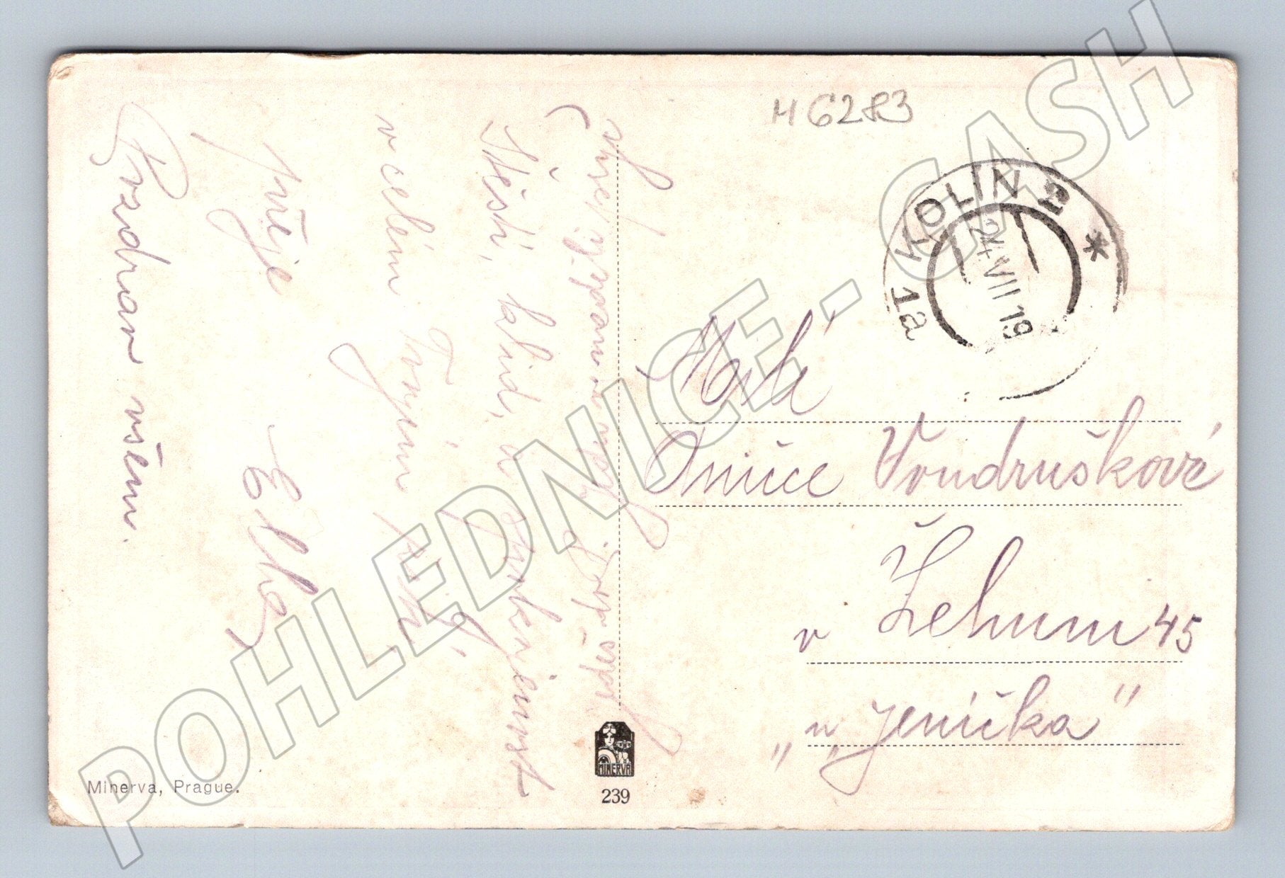 Pohlednice s portrétem mladé ženy v klobouku od malíře F. X. Naskeho. Na přední straně pohlednice je jemně malovaný motiv mladé dámy s typickými rysy umělecké secese. Pohlednice byla vydána nakladatelstvím Minerva, Praha, a je popsána jako Portrét umělkyně v několika jazycích na okraji. Zadní strana nese rukopisný text a razítko s datem 24. VIII. 1919 z Kolína. Celkově dobře zachovalý stav, známky stáří a běžného opotřebení. Historicky hodnotný kousek vhodný do sbírky pohlednic s uměleckými motivy.