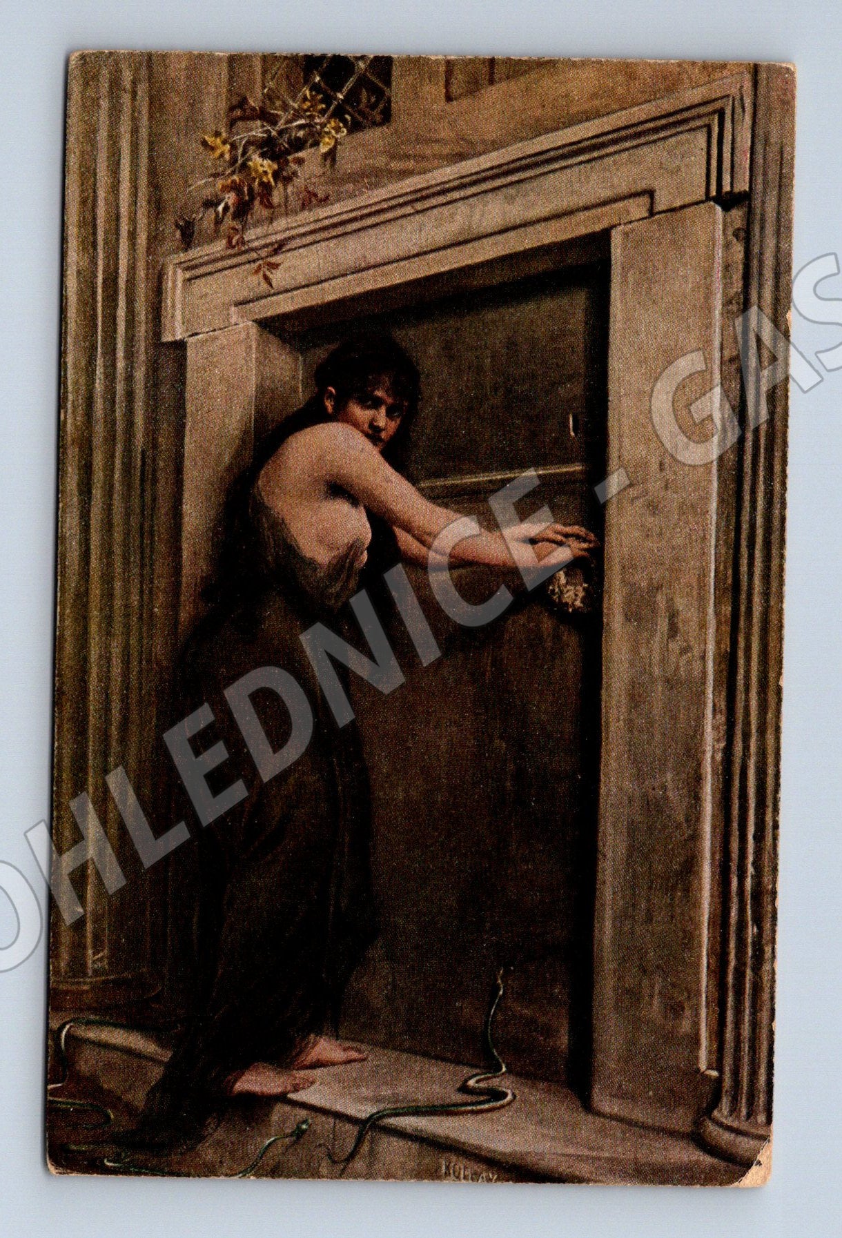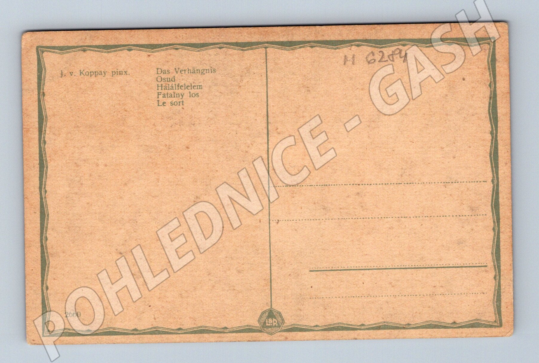 Starobylá pohlednice s reprodukcí malby od J. v. Koppay s názvem Osud (Das Verhängnis, Halálfelelem, Fatálny los, Le sort). Na pohlednici je vyobrazená dramatická scéna ženy v architektonickém prostoru se symbolem hada, která vyjadřuje silný emocionální náboj a osudovost. Na zadní straně jsou uvedeny tituly v několika jazycích, originální předtisk i prostor pro poštovní údaje. Pohlednice je ve sběratelském stavu, lehká patina odpovídající stáří. Vhodné pro sběratele uměleckých a tematických pohlednic.