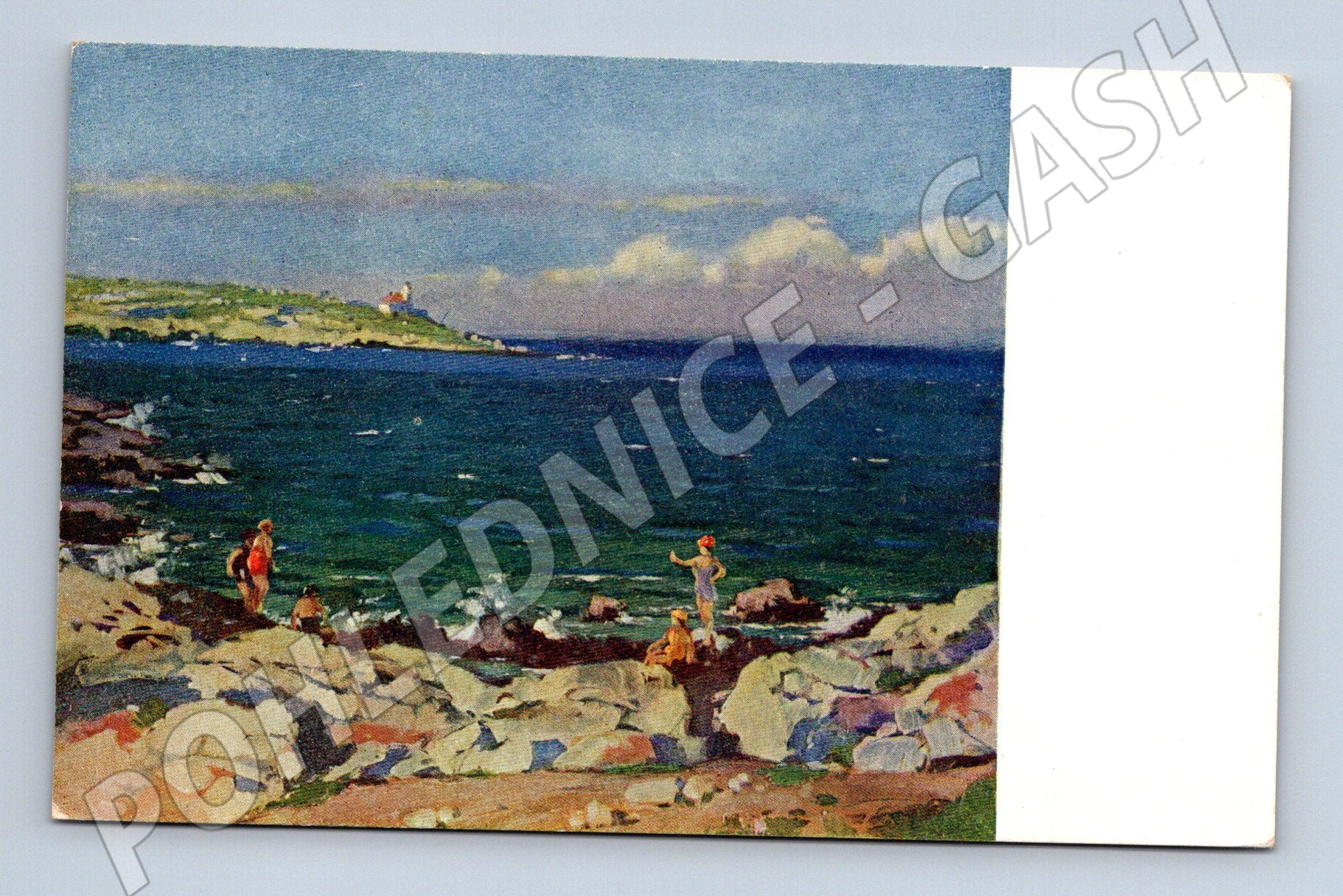 Originální stará pohlednice s malovaným motivem přímořské krajiny a postavami na pobřeží. Na titulní straně je umělecký výjev moře a skalnatého pobřeží se třemi postavami, v pozadí je vidět maják. Zadní strana je popsaná s adresou a obsahuje pět známek Deutsches Reich s portrétem Adolfa Hitlera, z období Protektorátu Čechy a Morava. Pohlednice byla odeslána a nese známky poštovního provozu. Skvělý sběratelský kus pro milovníky historických pohlednic a filatelii. Stav viz foto.