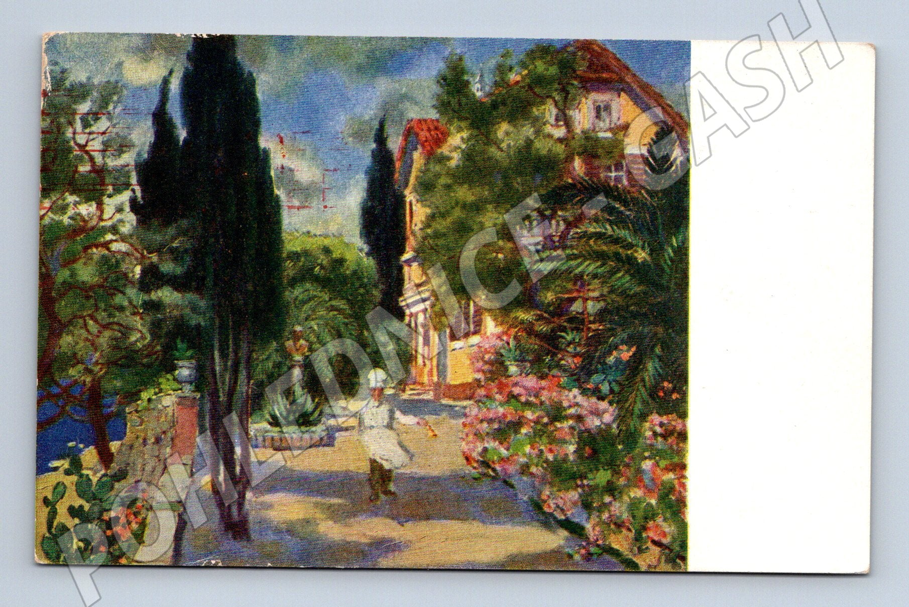 Nabízím originální pohlednici s motivem malovaného parku a vilky, pravděpodobně z období první poloviny 20. století. Na malbě je vyobrazen krásný zahradní park s rozkvetlými záhony, cypřiši, jezírkem a postavou dítěte v bílém oblečení. Druhá strana pohlednice je prošlá poštou s razítkem z Prahy a podpisem. Pohlednice nese známku Doplatné . Celkově dobrý stav, drobné opotřebení v rozích. Vhodné pro sběratele historických pohlednic i milovníky malířského umění.