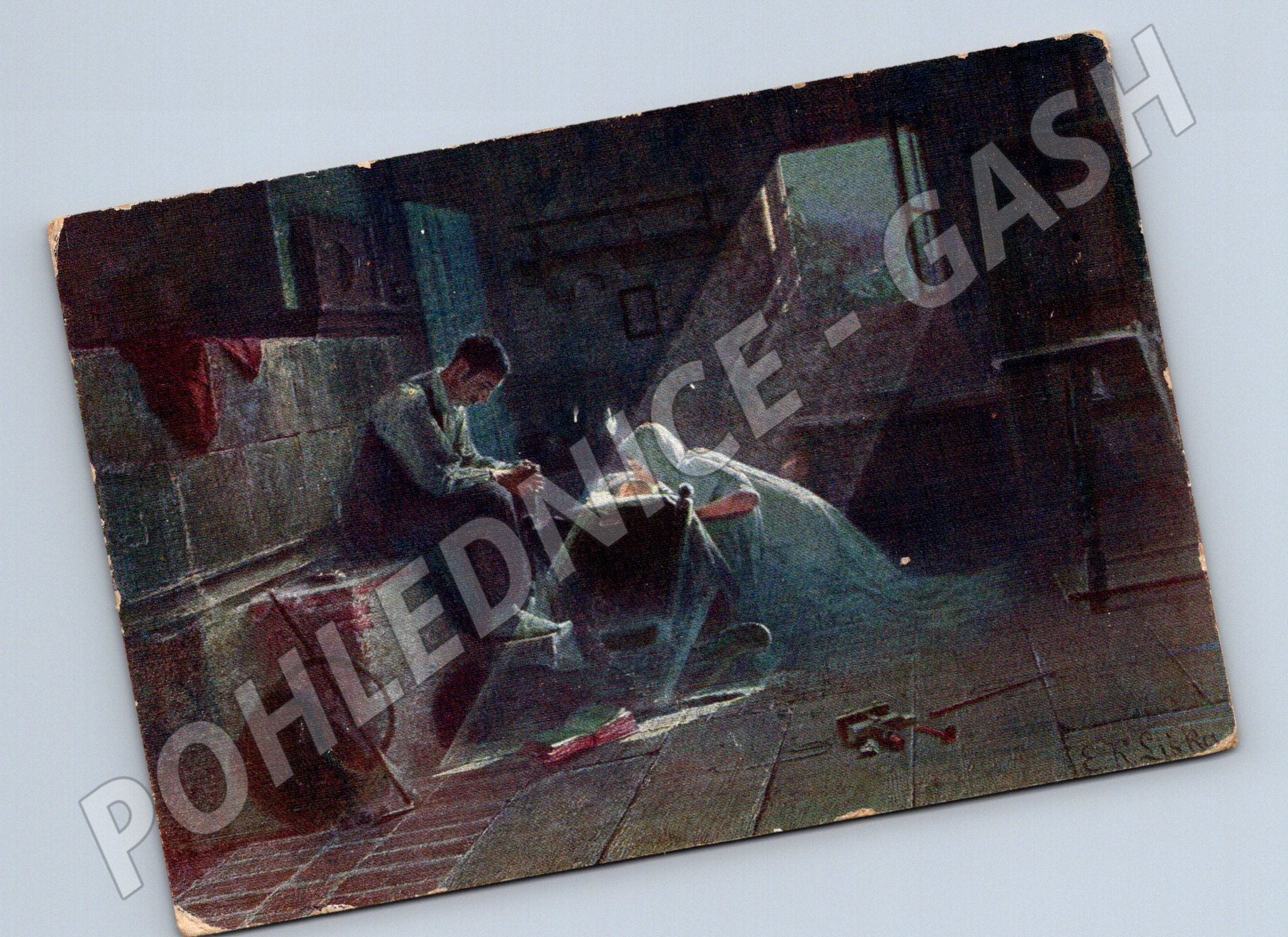 Starší pohlednice s reprodukcí obrazu od E. K. Lišky s názvem Le veuf / Der Witwer / Vdovec . Ilustrace zachycuje smutnou scénu vdovce sedícího u postele, což podtrhuje melancholickou atmosféru. Pohlednice byla odeslána v roce 1914, jak je patrné ze známky a razítka. Na rubu se nachází ručně psaný text, známka a poštovní razítko z doby Rakouska-Uherska. Stav viz foto – rohy mírně otřelé, patina stáří. Vhodné pro sběratele historických pohlednic, zájemce o umění a tematiku malířství.
