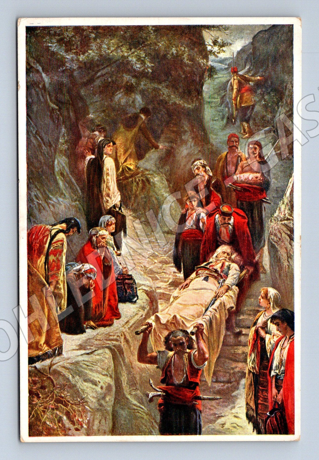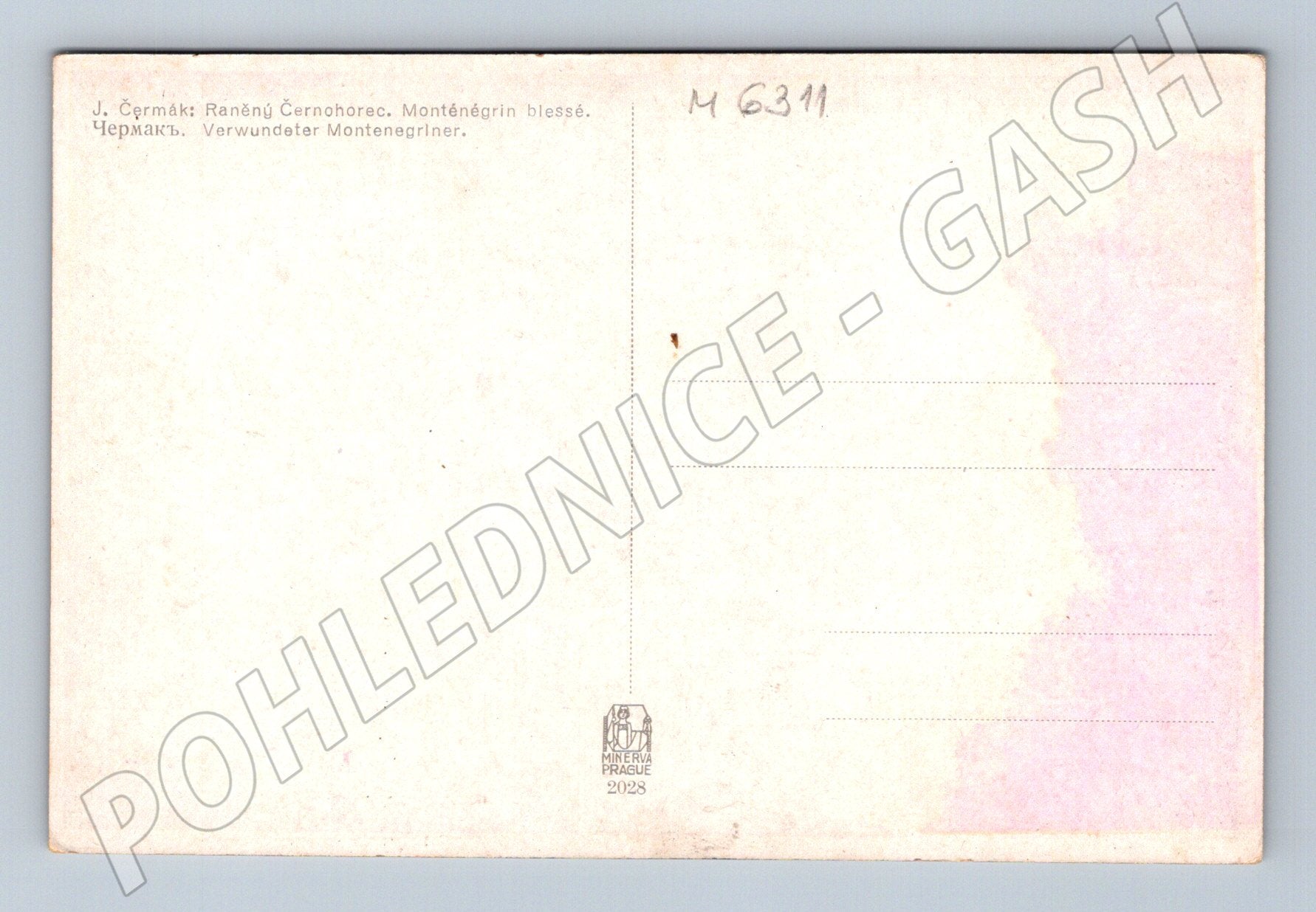 Pohlednice s reprodukcí slavného obrazu od Josefa Čermáka s názvem Raněný Černohorec (Monténégrin blessé, Verwundeter Montenegriner). Pohlednice je vydána vydavatelstvím Minerva, Praha, číslo 2028, a obsahuje popis ve více jazycích. Na přední straně je umělecké vyobrazení skupiny postav v tradičních balkánských krojích, které ošetřují zraněného muže. Zadní strana je nepopsaná, připravena pro odeslání. Velmi pěkný sběratelský kousek pro milovníky historického malířství a žánrových scén. Pohlednice nese drobné známky stáří.
