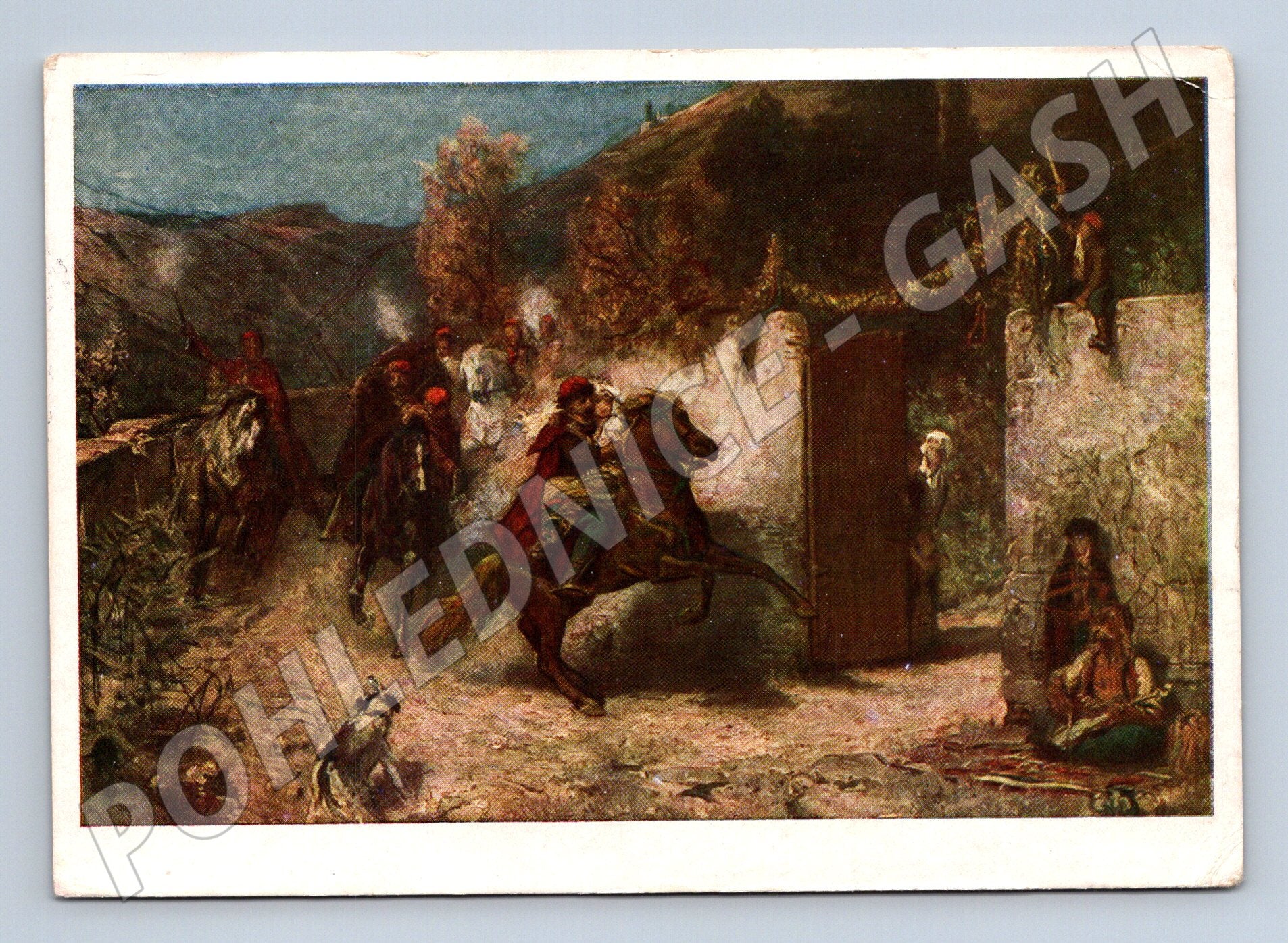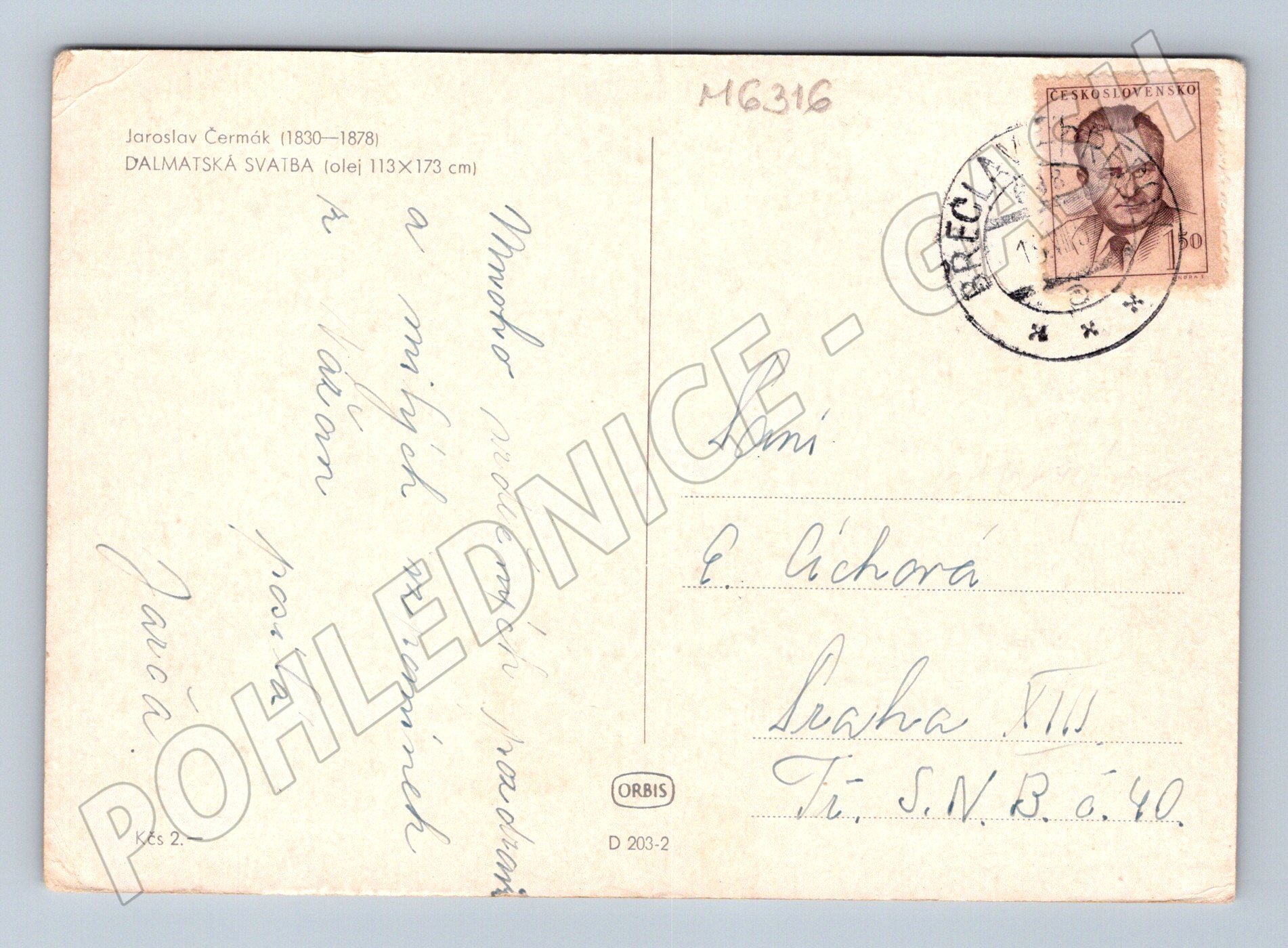 Originální stará pohlednice s motivem slavného obrazu Jaroslava Čermáka (1830–1878) s názvem Dalmatinská svatba (olej, 113 × 173 cm). Pohlednice je odeslaná, se známkou a razítkem z období Československa. Na přední straně umělecká reprodukce historické scény, na zadní text a známka. Celkový stav odpovídá stáří pohlednice, vhodná pro sběratele uměleckých pohlednic a zájemce o tvorbu Jaroslava Čermáka.