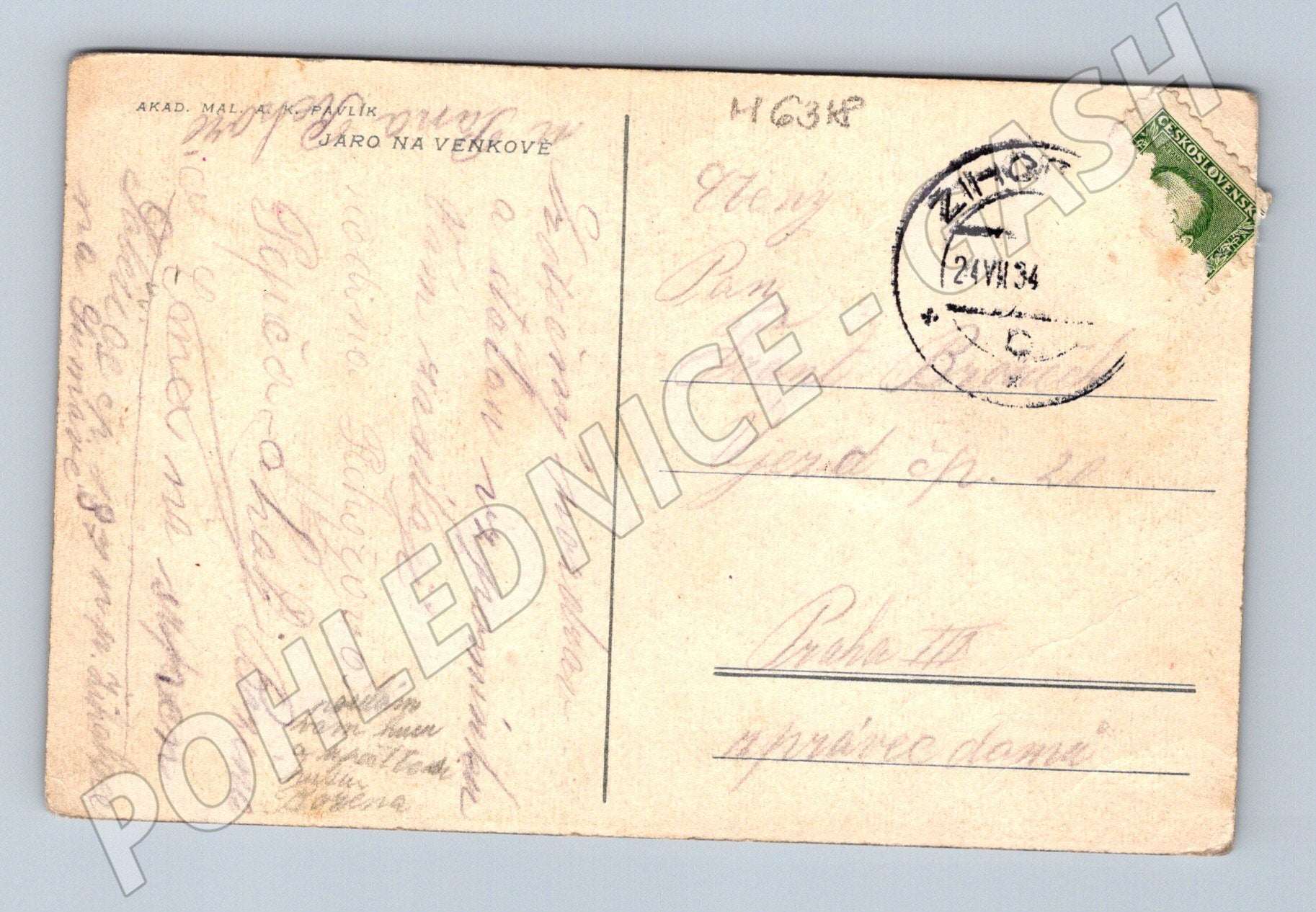 Originální historická pohlednice s názvem Jaro na venkově od akademického malíře A. K. Pavlíka. Na pohledu je krásná malovaná venkovská usedlost s rozkvetlým stromem, typická jarní atmosféra českého venkova. Pohlednice byla odeslaná v roce 1934, s razítkem a původní známkou Československo. Stav odpovídá stáří, rohy mírně opotřebené, adresní strana popsaná. Velmi pěkná ukázka české krajinomalby na pohlednici z první poloviny 20. století.