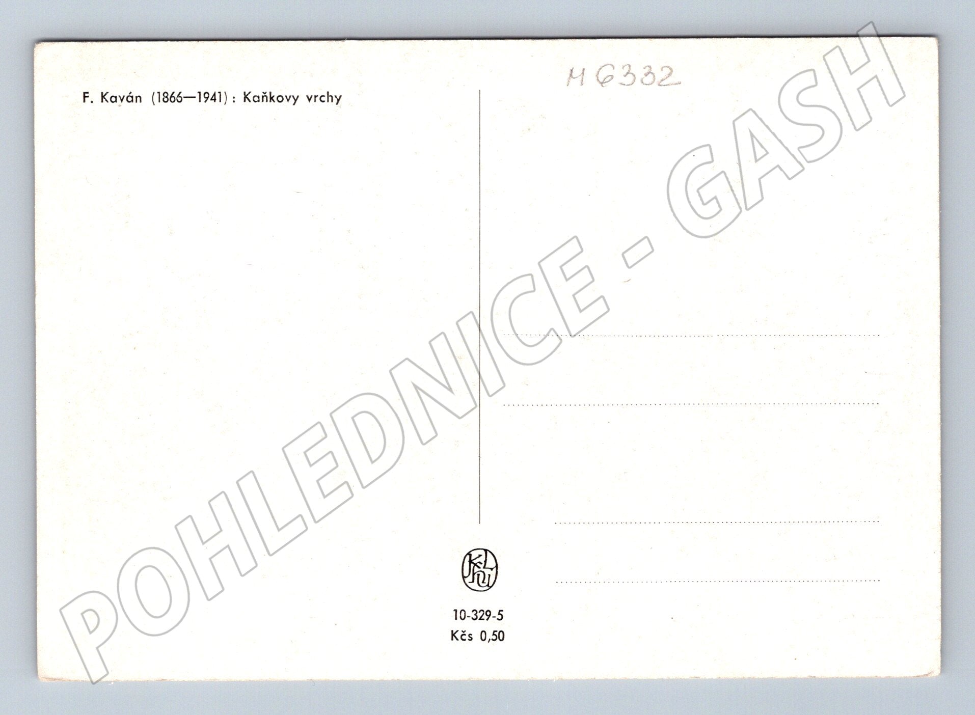 Originální pohlednice s názvem Kaňkovy vrchy od českého malíře F. Kavána (1866–1941). Motiv zachycuje malebnou krajinu s pohořím a charakteristickými stromy, typickými pro Kavánovu tvorbu. Jedná se o původní vydání, neprošlou poštou, v dobrém sběratelském stavu. Na zadní straně jsou informace o autorovi a místu, čistá pro adresu a vzkaz. Vhodné pro sběratele uměleckých pohlednic i milovníky krajinomalby.
