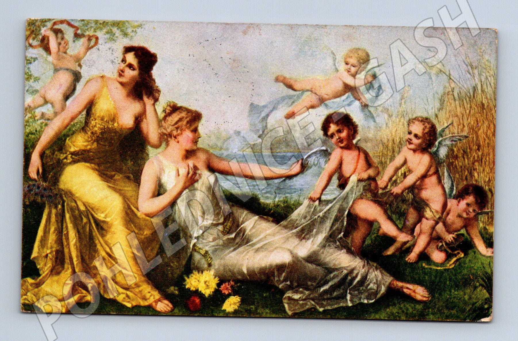 Nabízím starou malířskou pohlednici s romantickým motivem dvou žen a skupinky okřídlených andílků (putti) v přírodě u vody. Pohlednice je tištěná, pestrobarevná s množstvím detailů a znatelným dotykem dobové estetiky. Na rubu lze spatřit dobové ručně psané věnování, poštovní známky a razítko orazítkované roku 1903, které dokládá její stáří. Autorem obrazu je F. Lefler, jak je uvedeno na zadní straně, a pohlednice je označena titulem Skádlení, Übermut, Malicieus, Рызвость . Perfektní sběratelský kousek pro milovníky vintage malovaných pohlednic i zájemce o secesní a klasicistní motivy. Stav viz foto, známky opotřebení a stáří jsou patrné na zadní straně. Vhodné pro sběratele i jako dekorace.