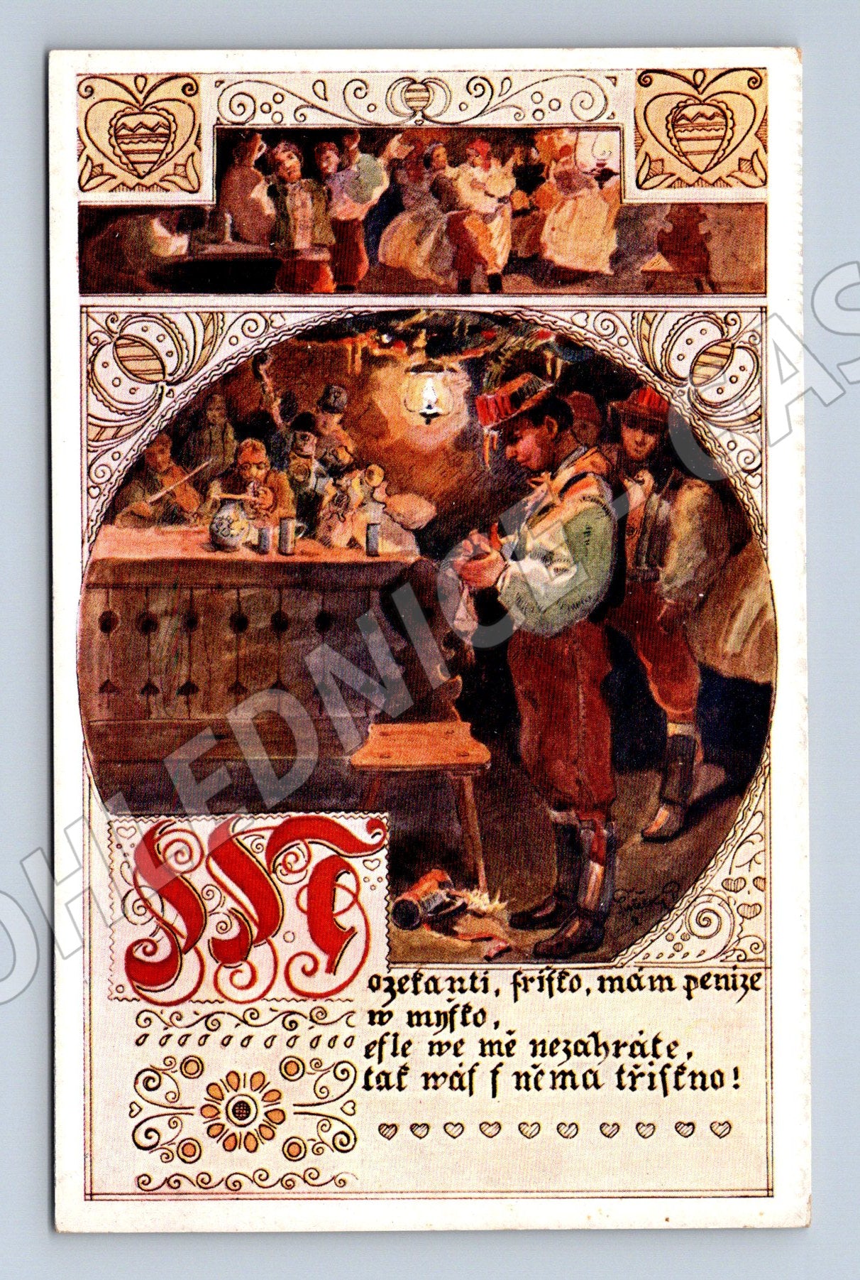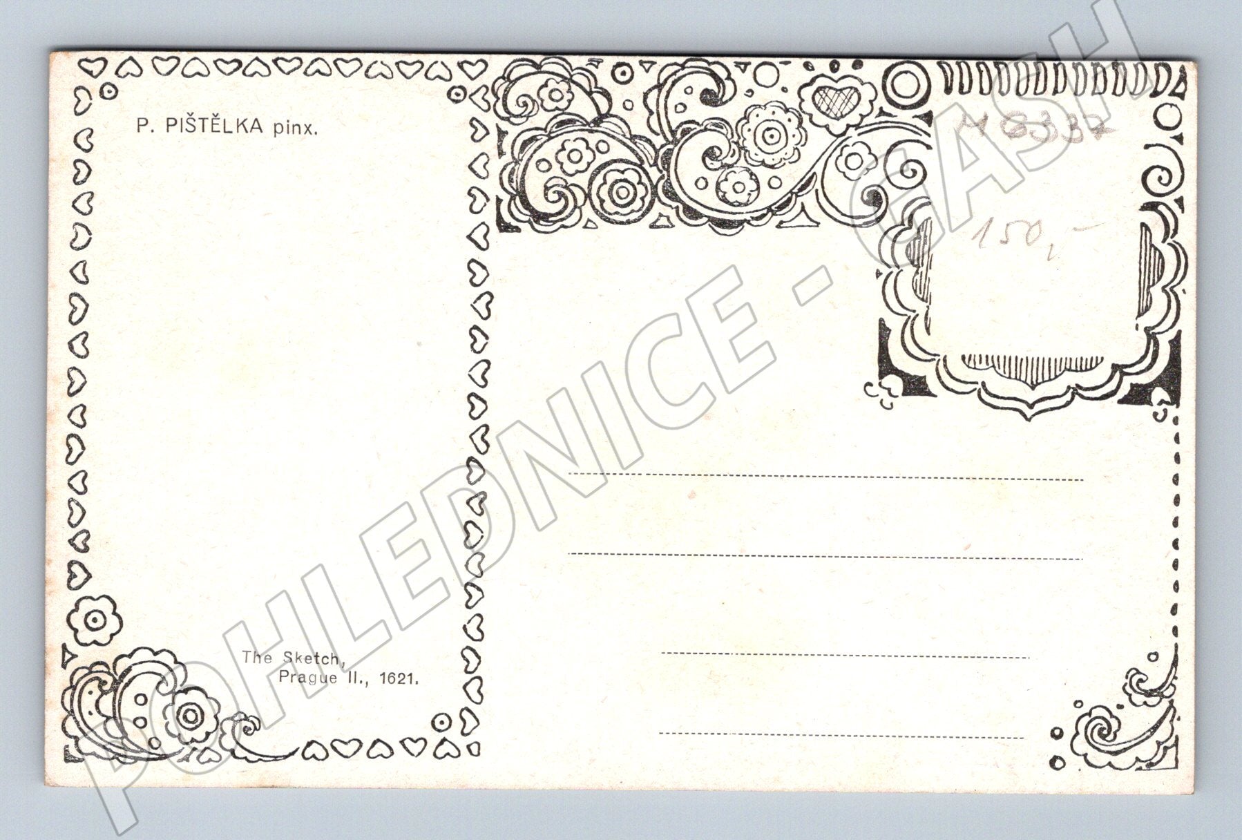 Starobylá pohlednice s malbou inspirovanou lidovým životem, na níž je zachycena skupina lidí v tradičních krojích, pravděpodobně u vesnické slavnosti. Uměleckou stránku pohlednice podtrhují bohaté dekorativní rámečky a kaligrafie na přední straně. Autorem malby je P. Pištělka, jak je uvedeno na zadní straně. Pohlednice byla vydána společností The Sketch, Prague II., roku 1621. Stav velmi dobrý, bez známek odeslání, vhodné pro sběratele etnografických či historických pohlednic.