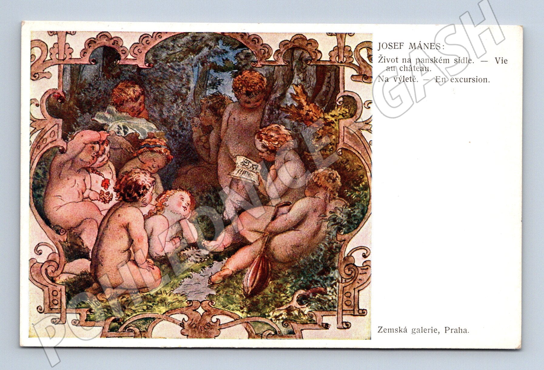 Umělecká pohlednice s reprodukcí díla Josefa Mánesa. Pohlednice nese název Život na panském sídle. Na výletě. a pochází ze Zemské galerie v Praze. Scéna zachycuje skupinu malých dětí v alegorickém či mytologickém stylu, typickém pro Mánesovu tvorbu. Na zadní straně je pohlednice nepopsaná, v dobrém stavu, bez známky. Krásná položka pro sběratele malířských a historických pohlednic, vhodná i jako dekorace nebo hodnotný dárek.