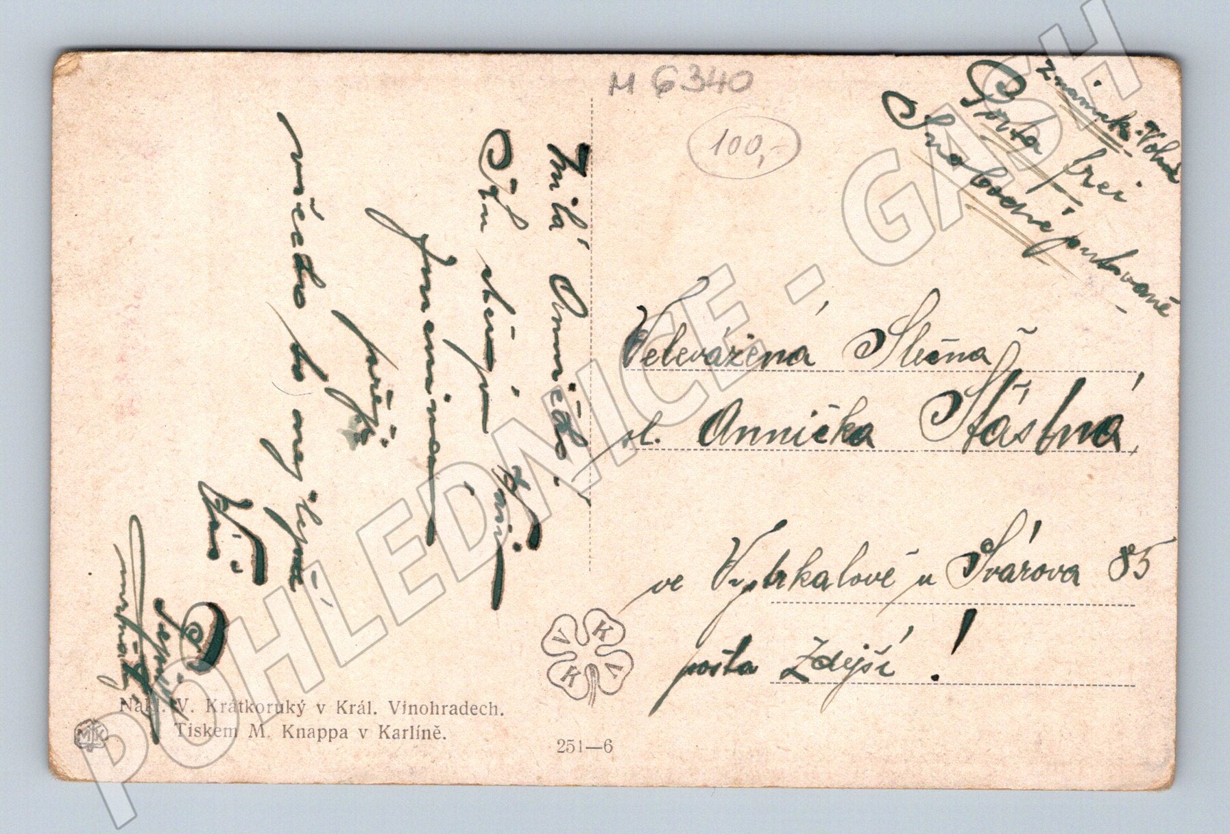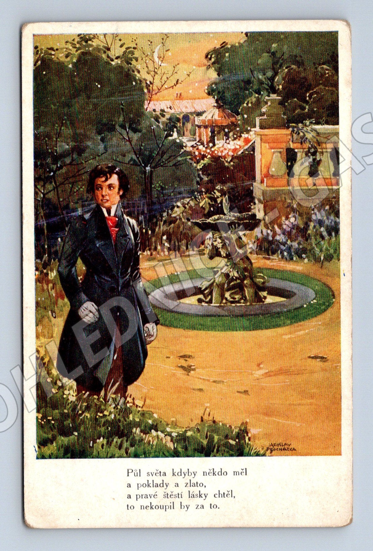 Starobylá pohlednice z období Rakousko-Uherska, vydaná nakladatelstvím V. Krátkoruký, tisk M. Knapp v Karlíně. Poštou prošlá, ručně psaná adresa i vzkaz na zadní straně. Na přední straně malovaný motiv muže ve společenském oděvu v parku u fontány, doplněný citátem: Půl světa, kdyby někdo měl a pokládal za to, a pravé štěstí lásky chtěl, to nekoupil by za to. Patina stáří, mírné opotřebení hran. Velmi krásný sběratelský kousek malé formy do roku 1950 vhodný do tematických kolekcí pohlednic s motivem ČR a každodenního života té doby.