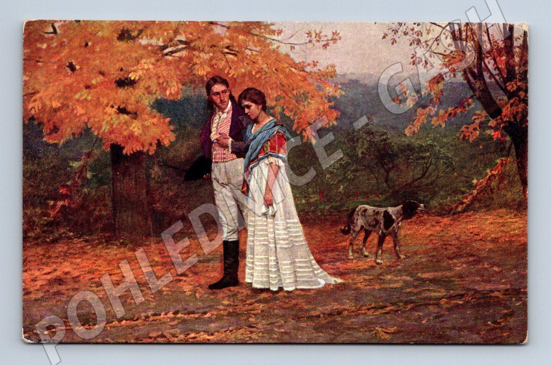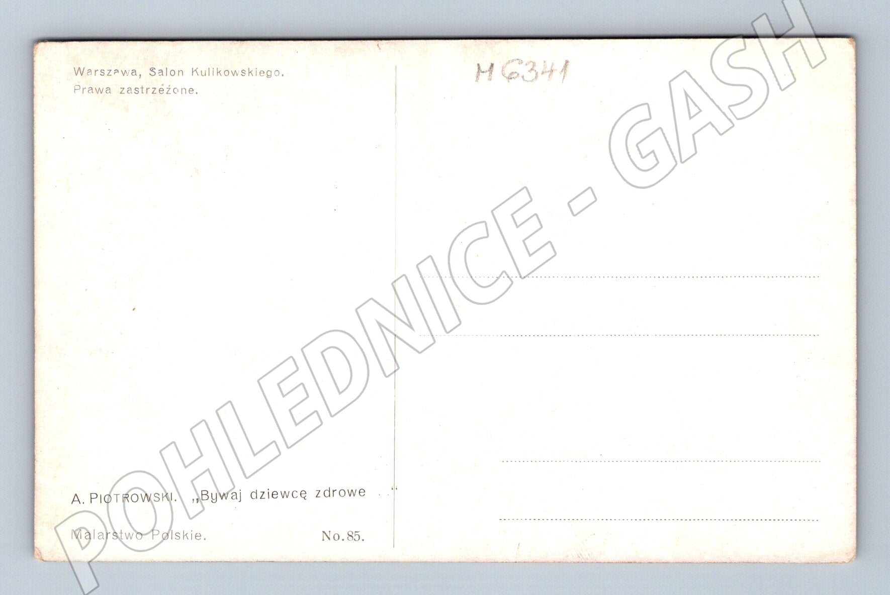 Originální pohlednice s reprodukcí malby od A. Piotrowského s názvem Bywaj dziewcę zdrowe z edice Malarstwo Polskie. Pohlednice zachycuje romantickou scénu dvou osob v podzimní přírodě, doprovázených psem. Vydal Salon Kulikowskiego ve Varšavě, pohlednice má číslování 85. Rub pohlednice je nepopsaný. Výborný stav, krásné barvy i detailní provedení, skvělý sběratelský kus zaměřený na polské malířství a romantické motivy. Vhodné pro milovníky historie, umění a pohlednic.