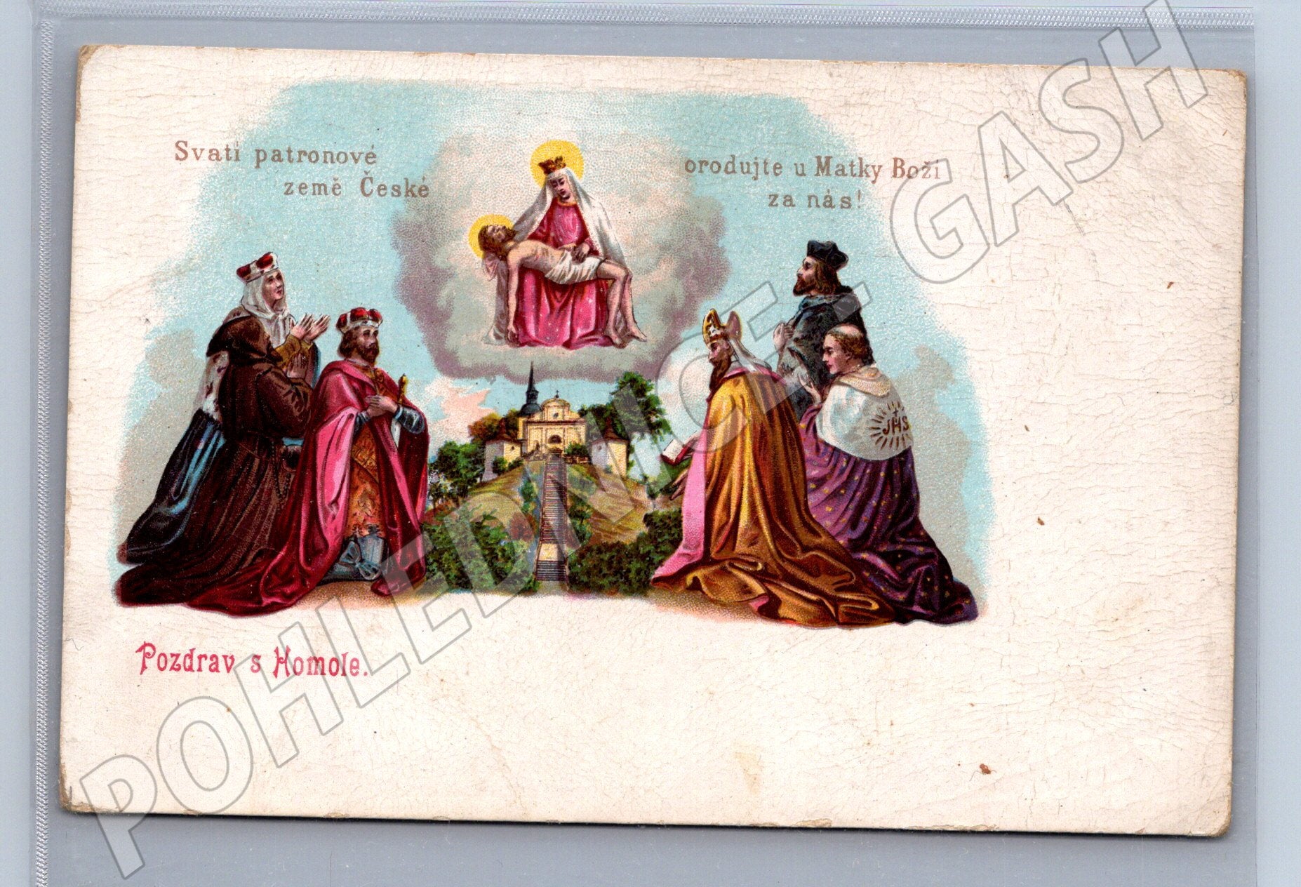 Starobylá pohlednice s názvem Pozdrav s Homole zachycující svaté patrony české země a motiv poutního místa Homole. Pohlednice je ve velmi zachovalém stavu, s mírným opotřebením odpovídajícím svému stáří. Na přední straně barevná litografie s náboženským motivem a českým textem: Svatí patronové země České, orodujte u Matky Boží za nás! Zadní strana rozdělena na adresní řádky a místo pro známku, nepopsaná. Jedná se o sběratelsky zajímavý kousek vhodný do kolekce historických pohlednic ČR do roku 1950.