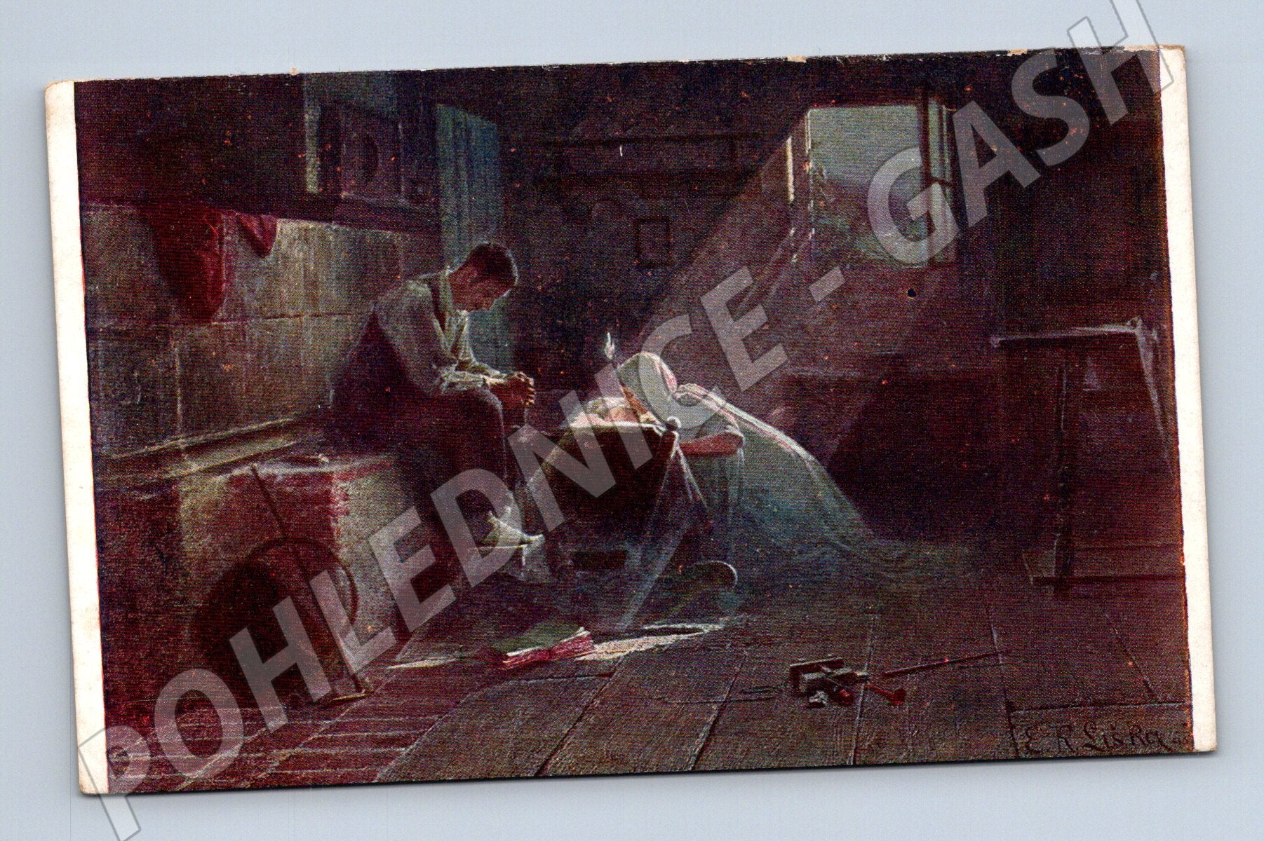 Starší pohlednice s reprodukcí malby E. K. Liška: Vdovec (Widower). Pohlednice zachycuje dojemnou scénu muže sedícího u kolébky s dítětem v podkrovním pokoji, prostoupeném slunečními paprsky. Ve spodní části je označení Salon J.P.P. a číslo 1017, vydavatel J. Plichta, Praha. Na zadní straně vícejazyčný popis názvu a vyhrazená práva. Pohlednice má originální, nepopsanou zadní stranu a nese známky stáří. Vhodné pro sběratele historických nebo uměleckých pohlednic.