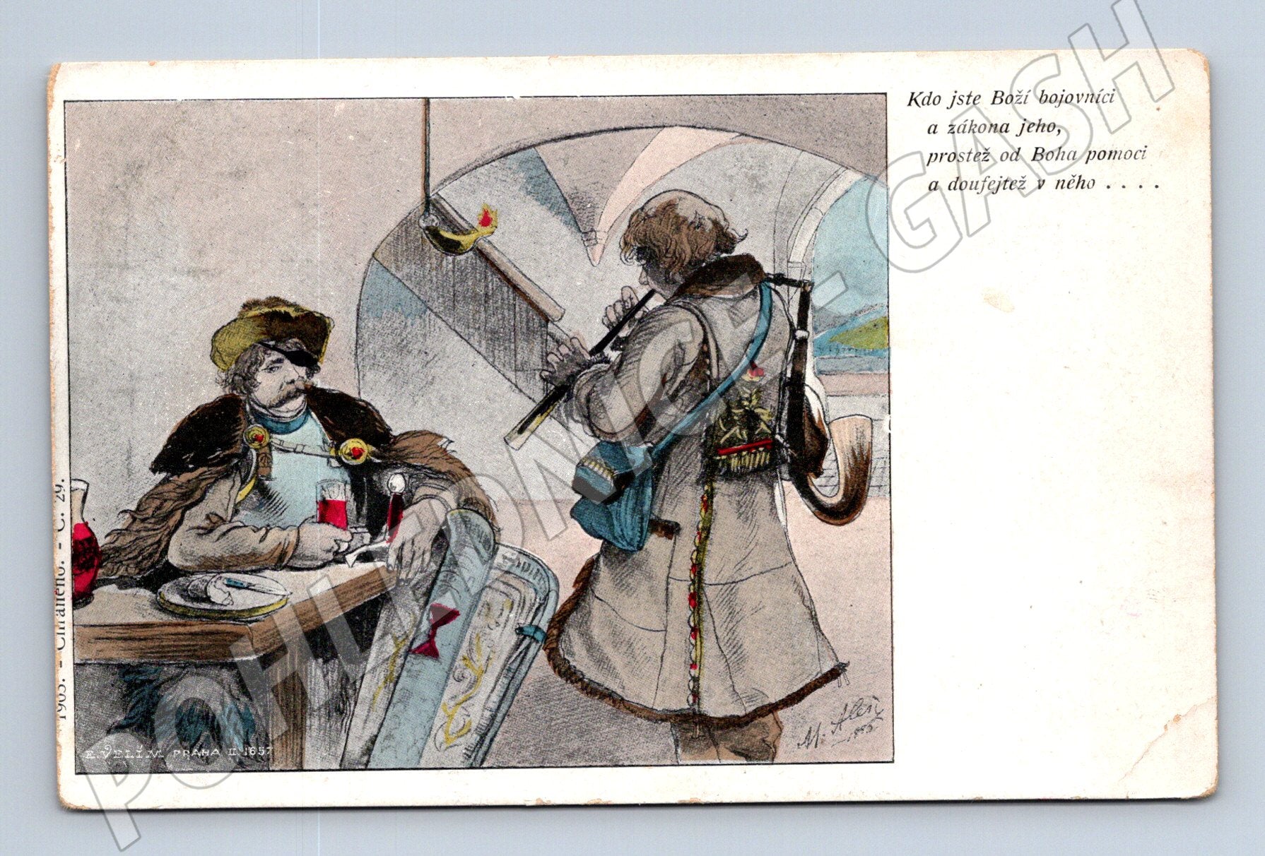 Starší pohlednice z edice Z Českých dějin č. 4 dle Mikoláše Alše. Barevná ilustrace ztvárňuje historickou scénu s postavami v kostýmech z husitského období; jedna z postav sedí u stolu s jídlem a nápojem, druhá opouští místnost ozbrojená zbraněmi. Na pohlednici je citát: Kdo jste Boží bojovníci a zákona jeho, prostež od Boha pomoci a doufejtež v něho... Pohlednice je podepsána M. Aleš 1903. Na zadní straně portrét Mikoláše Alše a jeho podpis. Vydal F. Velím, Praha, starý tisk. Pohlednice nese znaky stáří a patiny.