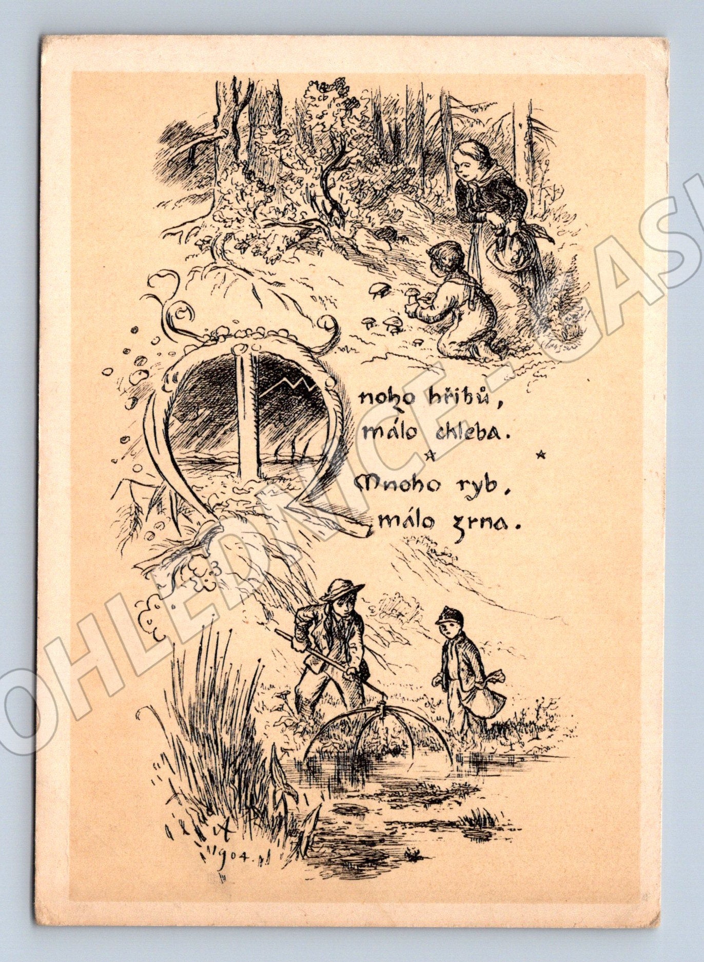 Originální stará pohlednice s ilustrací od slavného českého malíře Mikoláše Alše. Pohlednice obsahuje humorný kreslený motiv dvou postav v přírodě s českým textem: mnoho hub, málo chleba. mnoho ryb, málo sňat. Na zadní straně je uvedeno Kreslil M. Aleš , v dolní části výrobní údaje a cena 1 Kčs. Pohlednice je neprošlá poštou a ve velmi pěkném stavu, vhodná pro sběratele starých českých pohlednic, milovníky výtvarného umění i zájemce o dílo Mikoláše Alše. Vydavatelství Orbis. Skvělý doplněk do každé sbírky.