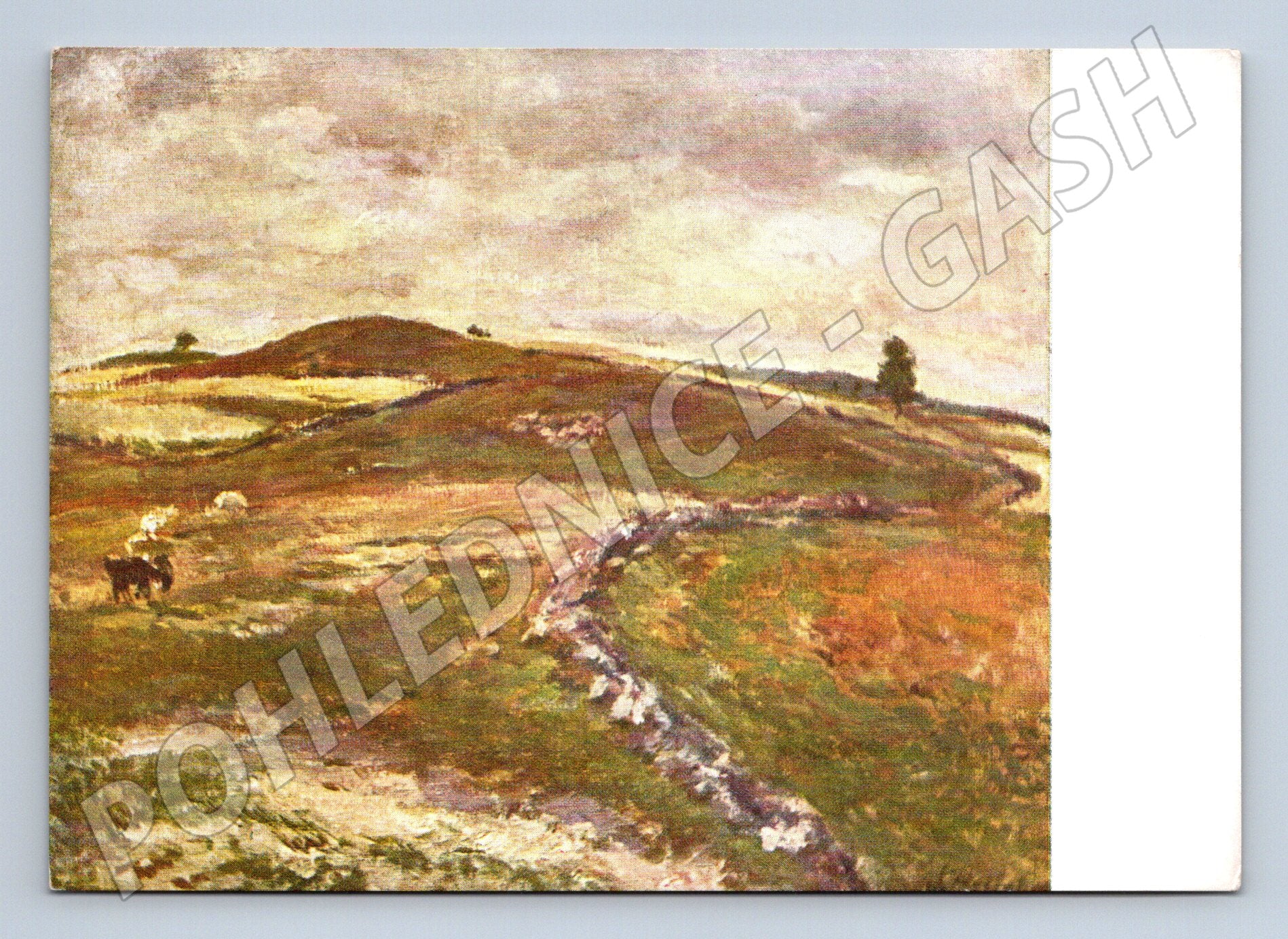 Pohlednice s reprodukcí obrazu od Jindřicha Průchy: Kozí hřbety. Typický krajinářský motiv vyvedený malířskou technikou, zachycující českou krajinu s pastvinami a zvlněnými kopci, s několika pasoucími se zvířaty. Pohlednice je nepopsaná, ve velmi dobrém stavu, vydavatel Orbis. Vhodné pro sběratele malířských pohlednic nebo zájemce o českou krajinu. Rozměr běžného formátu, zadní strana určena k napsání adresy a zprávy.