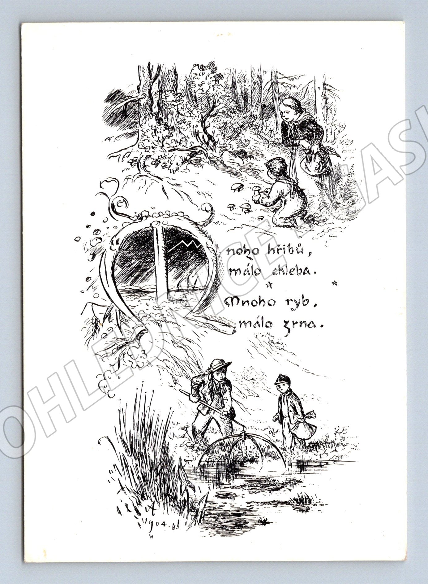 Originální pohlednice s černobílou kresbou od M. Aleše, vydaná tiskem Severografia Děčín. Pohlednice zobrazuje venkovskou scénu s dvěma postavami u vody a nese humorný český nápis: Mnoho hříbů, málo chleba. Mnoho ryb, málo sýra. Pohlednice je nepopsaná, ve výborném stavu, vytištěna v Československu, značení 10-625/VI-15. Výjimečný sběratelský kousek pro milovníky malířství i české ilustrace. Rozměr klasického formátu. Cena z původní doby výroby: 0,30 Kčs. Vhodné pro sběratele pohlednic i příznivce tvorby M. Aleše.