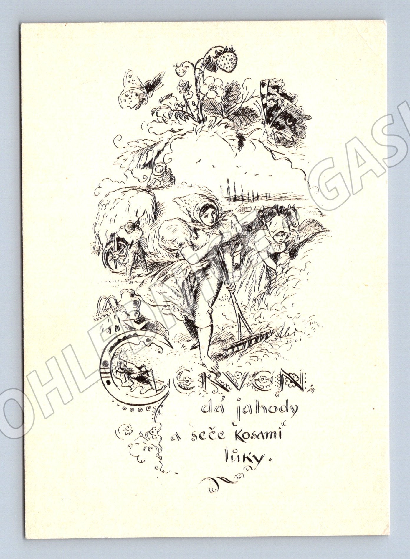 Originální pohlednice s černobílou kresbou autora M. Aleše, vydaná tiskem Severografia Děčín. Na pohlednici je detailně zpracovaná ilustrace se scénou sekače na louce s kosou, obklopeného přírodními motivy – například jahodami, květinami a dalšími dekorativními prvky. Ve středu ilustrace je také český nápis: dal jahody a seče kosami lučiny . Pohlednice je nepopsaná a ve vynikajícím sběratelském stavu. Skvělý přírůstek do sbírky uměleckých a ilustrovaných pohlednic českých malířů.
