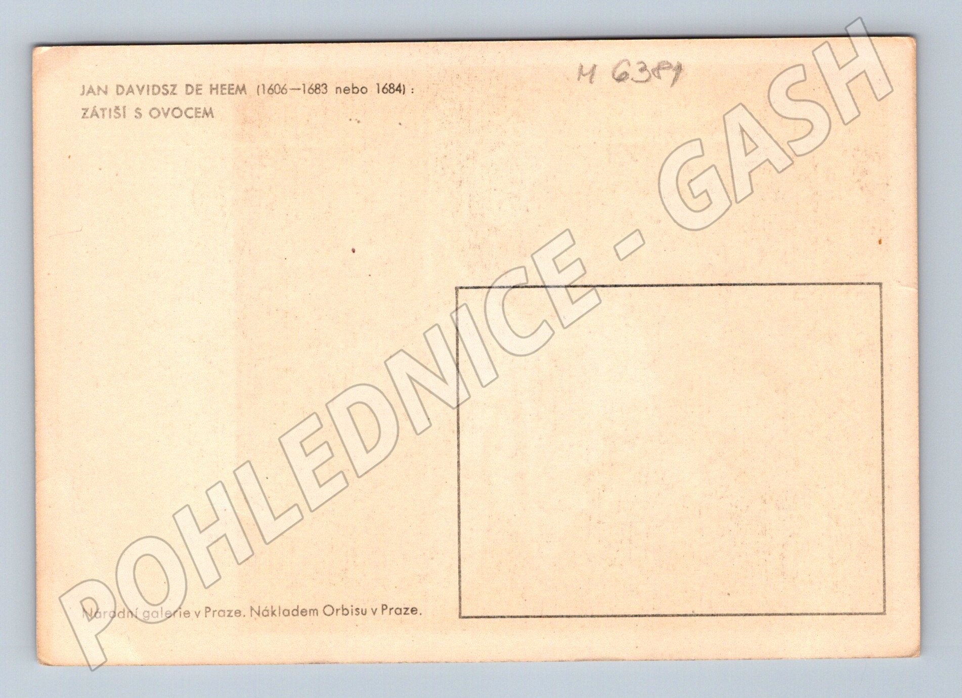 Sbírková pohlednice s reprodukcí díla Jana Davidsze de Heem (1606–1683/1684), holandského barokního malíře, známého svými detailními zátišími. Tato pohlednice nese motiv Zátiší s ovocem a byla vydána Národní galerií v Praze prostřednictvím nakladatelství Orbis. Na zadní straně naleznete popis a místo pro známku i adresu. Pohlednice pochází z období kolem poloviny 20. století, je neprošlá a v dobrém sběratelském stavu s drobnými známkami stáří. Ideální přírůstek do sbírky pohlednic malířství či tematických zátiší.