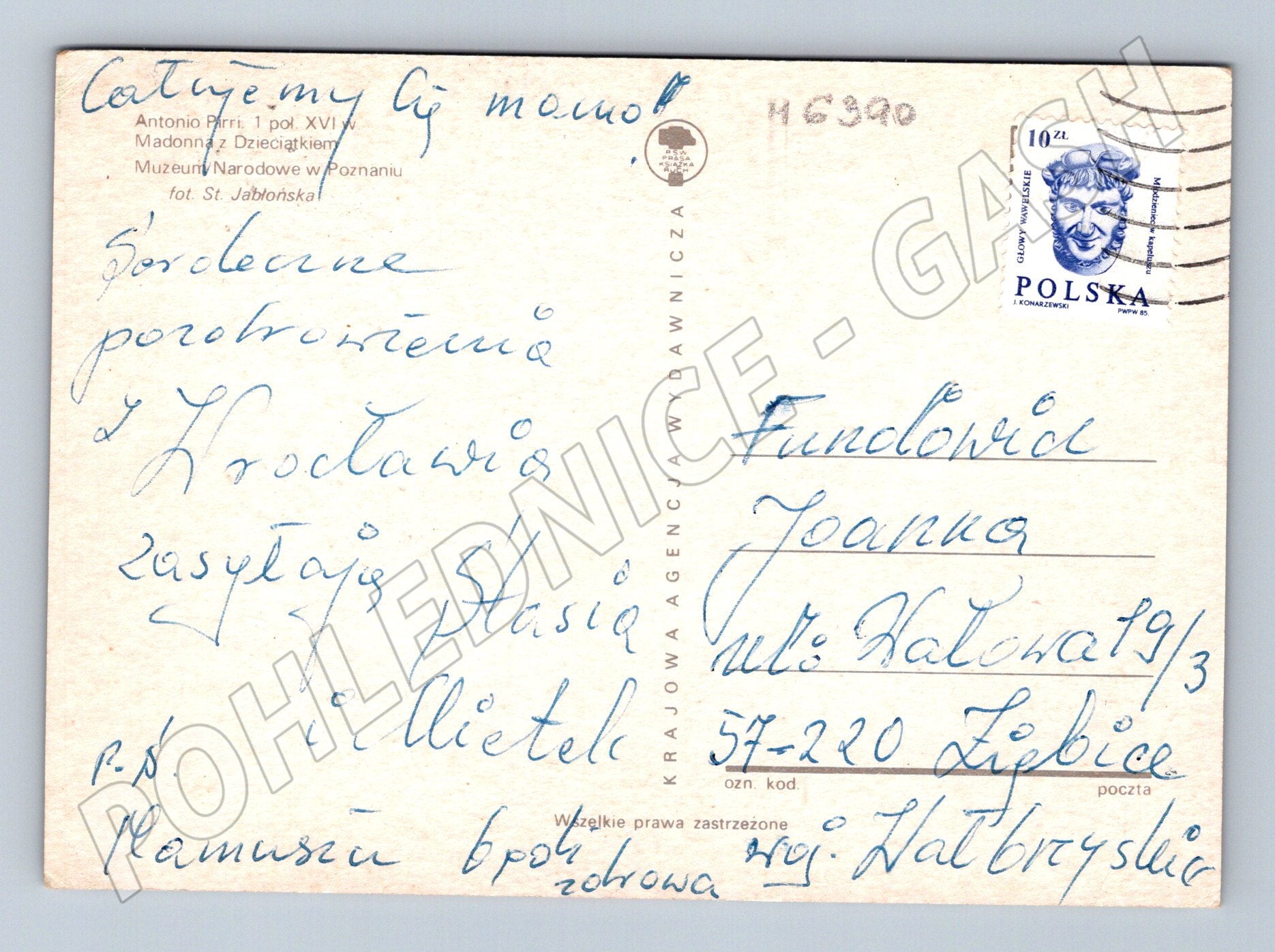 Originální pohlednice s reprodukcí obrazu Madonna z Dzieciątkiem od Antonia Pirriho (1. polovina 16. století). Pohlednice byla vydána Muzeem Narodowym v Poznani a je opatřena ručně psaným textem a polskou poštovní známkou v hodnotě 10 zł. Skvělý sběratelský kousek pro milovníky starých malířských pohlednic a historických artefaktů. Rozměr klasického pohlednicového formátu. Stav viz foto, menší opotřebení odpovídající stáří.