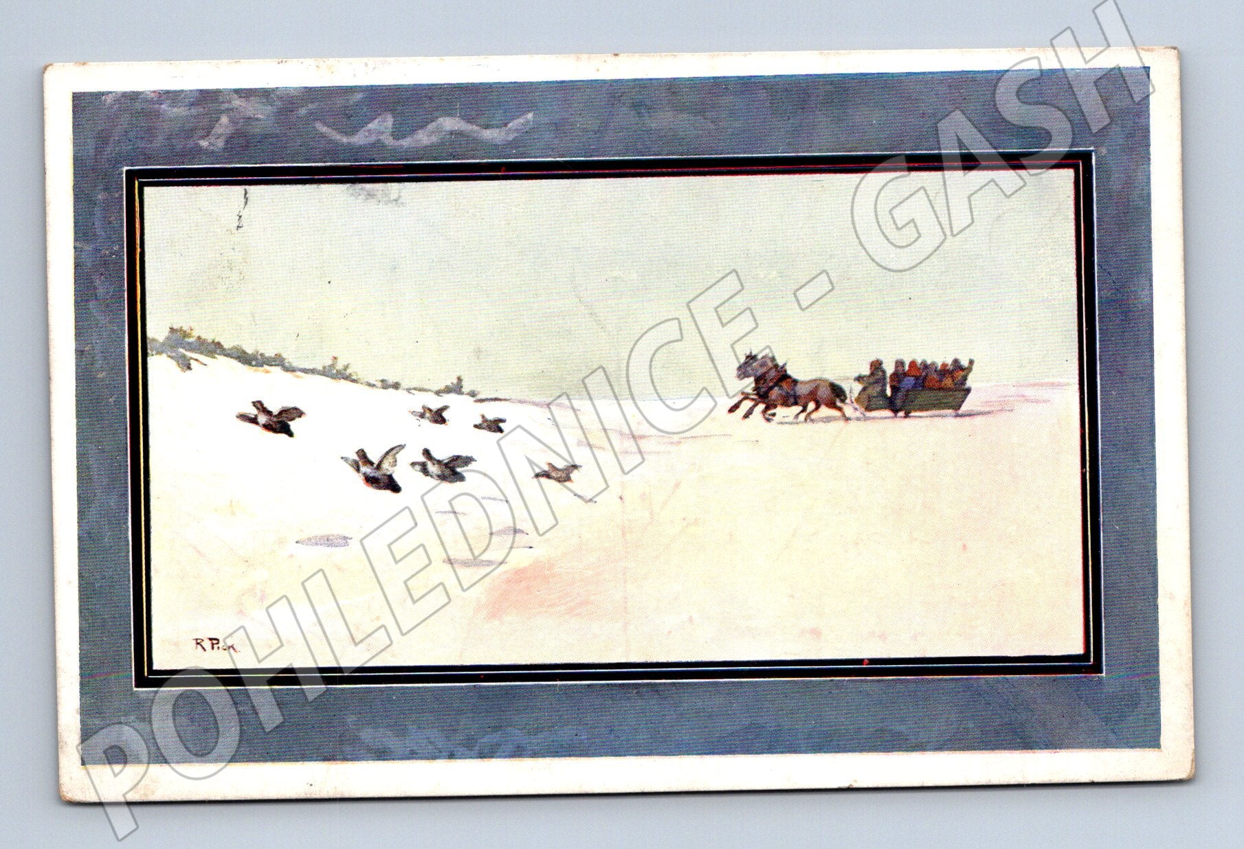 Originální stará pohlednice s motivem zimní krajiny, na které je vyobrazena jízda na saních tažených koňmi zasněženým krajem. V popředí lze vidět letící hejno ptáků. Pohlednice byla zaslána, na zadní straně se nachází rukopisný text, adresa a dobová známka s razítkem. Formát pohlednice odpovídá menšímu rozměru, který byl běžný do roku 1950. Jedná se o zajímavý sběratelský kousek s možností dokreslení dobové atmosféry Slovenska. Pohlednice nese opotřebení odpovídající stáří (viz foto).