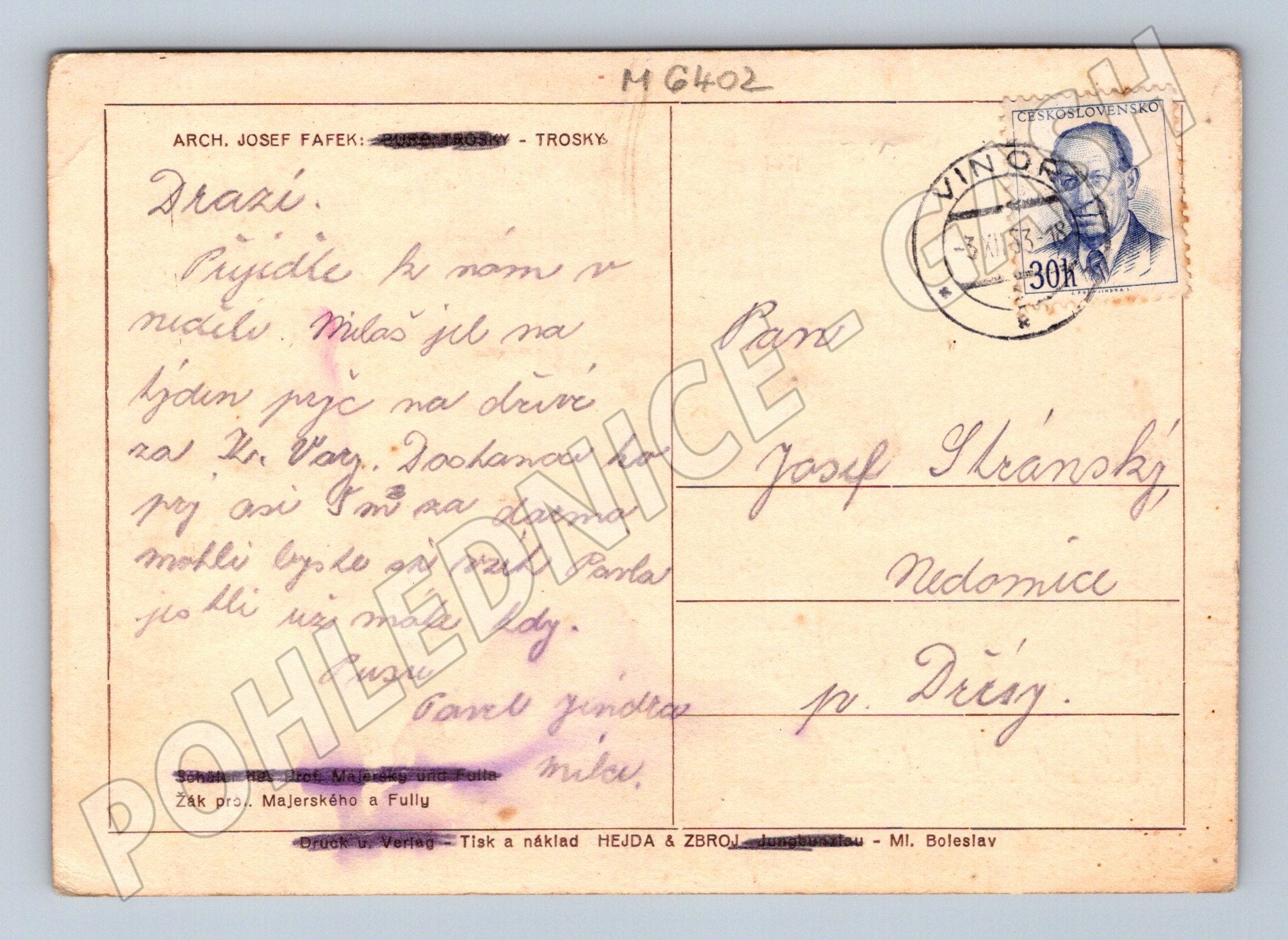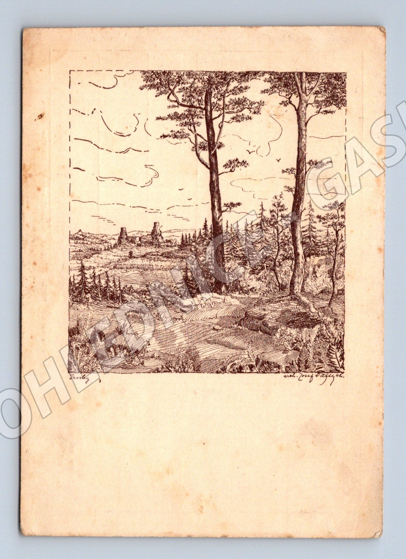 Nabízím starou pohlednici z českých krajů, malý formát, která zachycuje detailní kresbu krajiny s typickými stromy a skálami. Na zadní straně je ručně psaný vzkaz, adresa příjemce a původní poštovní známka Československo v hodnotě 30 h se strojovým razítkem. Vydavatel: Tisk a náklad HEJDA & ZBROJ, Mladá Boleslav, žák pro Majerského a Fully, arch. Josef Fafek – Trosky. Pohlednice je sběratelsky zajímavá, nese stopy stáří a drobné skvrny. Originální kus pro milovníky historie a české krajiny.