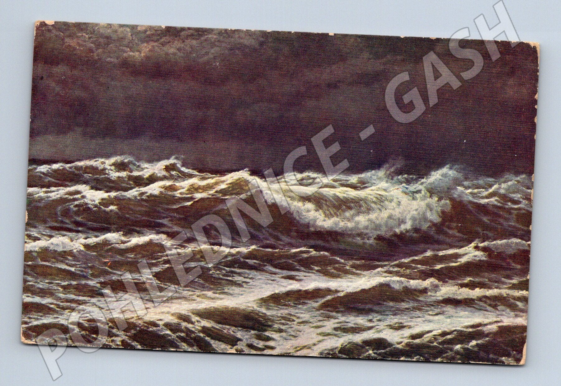 Historická pohlednice s motivem rozbouřeného moře před bouří (předloha Wartan Mahokian), s popisem ve čtyřech jazycích. Odesláno s rakouskou známkou z roku 1914, s ručně psaným textem a adresou. Stav pohlednice odpovídá stáří, rohy jsou mírně opotřebované. Vhodné pro sběratele historických pohlednic či milovníky námořní tématiky.