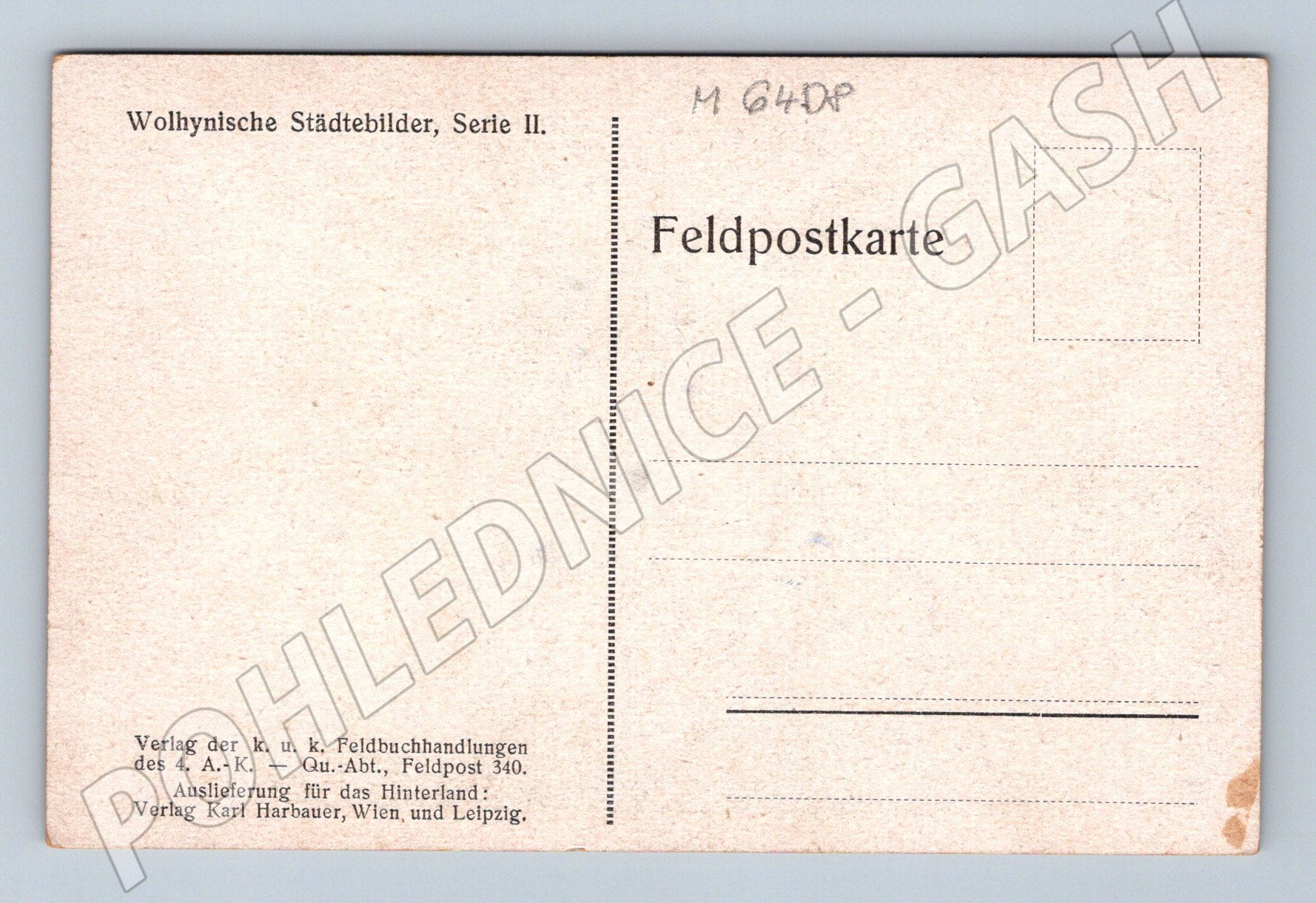 Originální stará polní poštovní pohlednice (Feldpostkarte) z cyklu Wolhynische Städtebilder, Serie II. vydaná kolem roku 1917. Na přední straně je akvarelem malovaný židovský hřbitov v městečku na Volyni (dnešní Ukrajina). Pohlednice pochází z Rakousko-Uherska, vydavatel Karl Harbauer, Wien und Leipzig pro 4. armádní sbor. Jedná se o historicky cennou a sběratelsky vyhledávanou pohlednici z oblasti s bohatou židovskou kulturou. Neprošlá poštou, velmi dobrý stav, drobné stopy stáří viz foto.