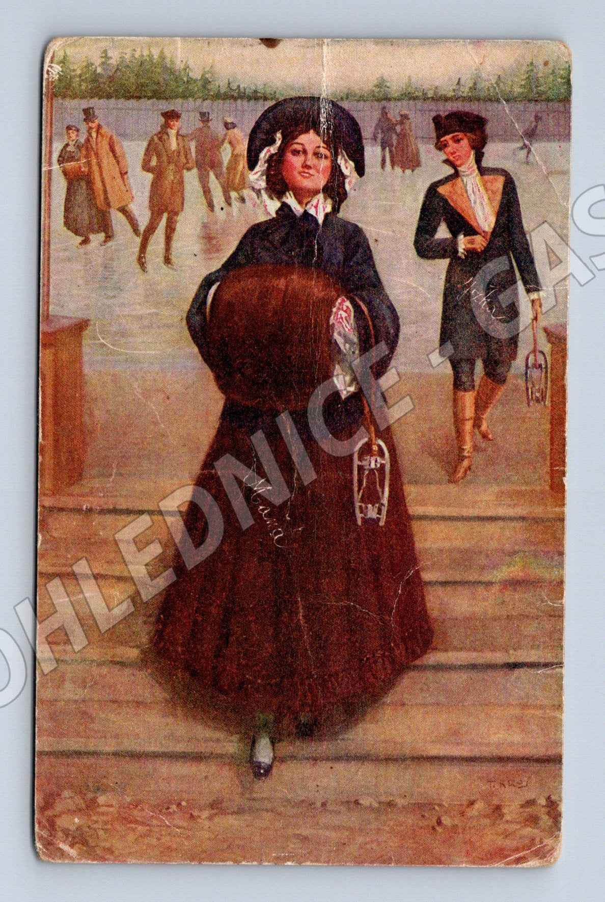 Starobylá malovaná pohlednice – dáma a pán v dobovém kroji lední Brusle