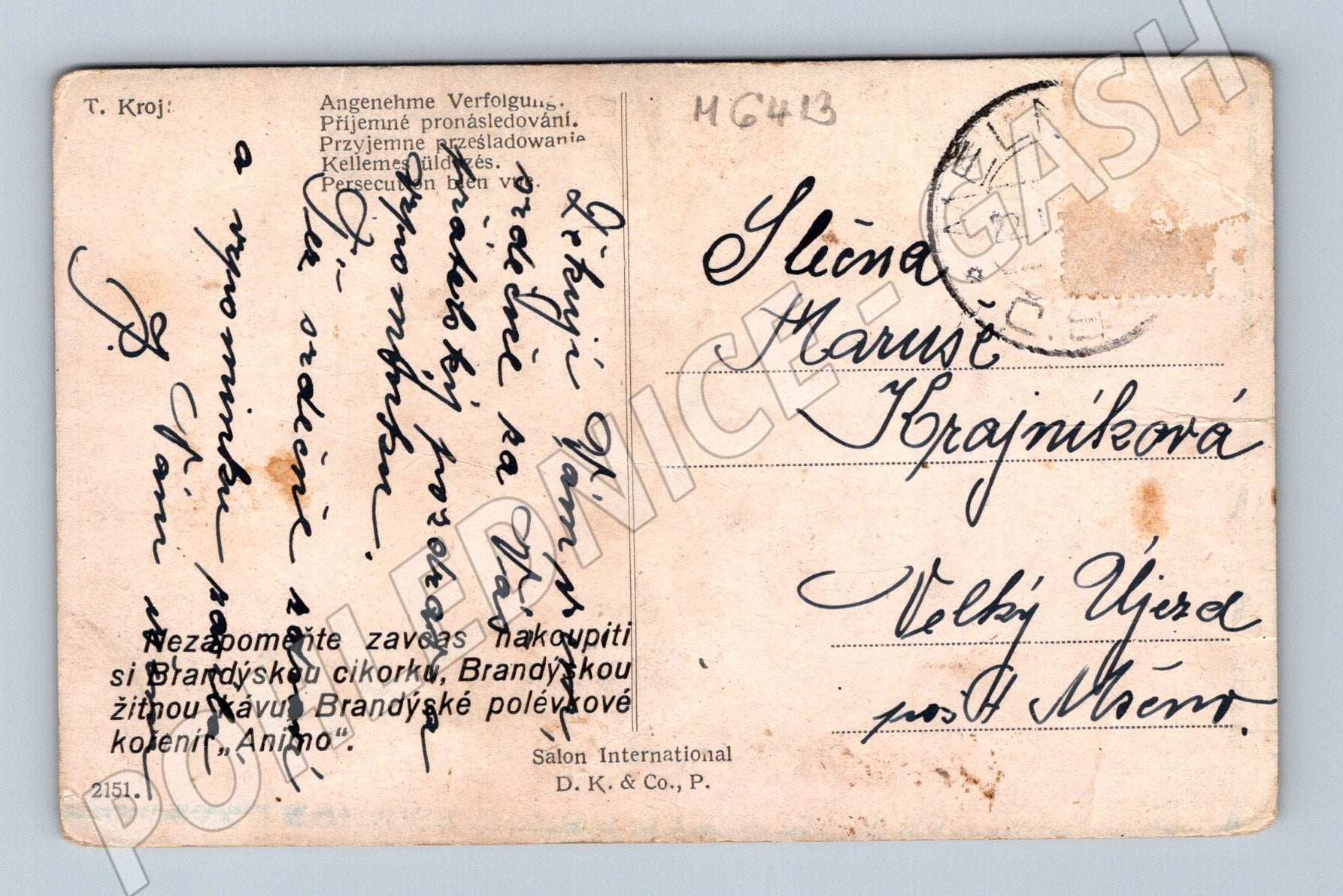 Starobylá pohlednice s motivem ze života na přelomu 19. a 20. století. Na přední straně je malovaná scéna s dámou a pánem v dobových krojích procházejícími se po promenádě, v pozadí jsou další postavy. Pohlednice je tištěná, barevná, s patrnými stopami stáří, ohyby a drobnými skvrnami. Na zadní straně se nachází ručně psaný text a adresa adresátky, použitá známka byla odstraněna. Částečně čitelná poštovní razítka a reklama na výrobky z Brandýsa. Pohlednice je vhodná pro sběratele historických malovaných motivů nebo zájemce o korespondenci z počátku 20. století.