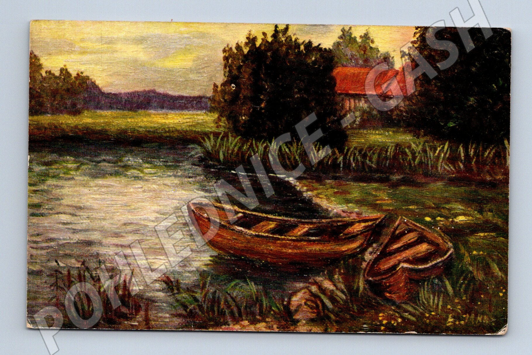 Nabízím originální malířskou pohlednici s motivem klidné venkovské krajiny u vodní hladiny, kde jsou vyobrazeny dvě dřevěné loďky na břehu rybníka či jezera. V pozadí se nachází vesnická stavení, husté stromy a zapadající slunce. Jedná se o barevnou pohlednici, pravděpodobně z 1. poloviny 20. století, vydanou v Německu (signováno: 1464 E. Jahn – Am Dorfteich, Printed in Germany). Zadní strana je čistá – nepopsaná. Velmi pěkný kousek pro sběratele pohlednic s tematikou vodní dopravy a malebné přírody.