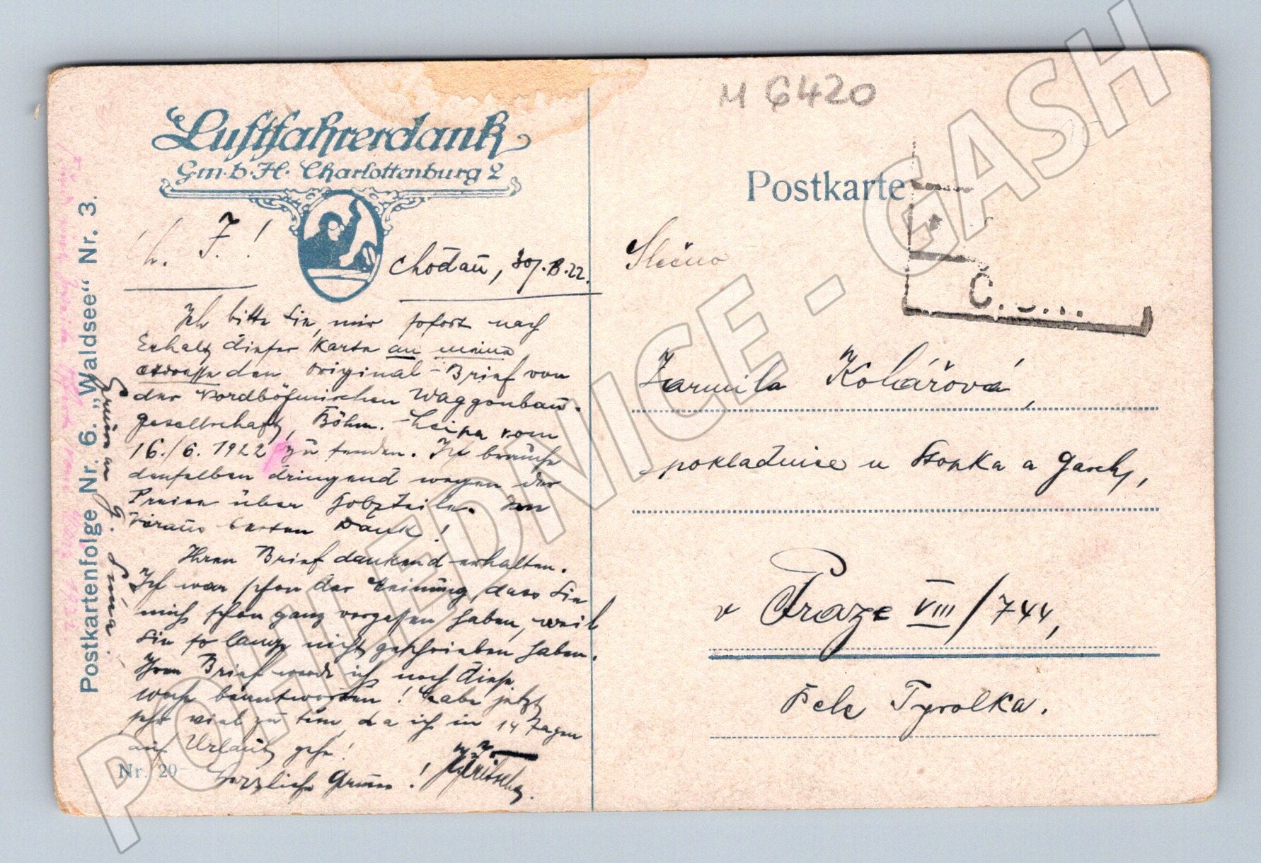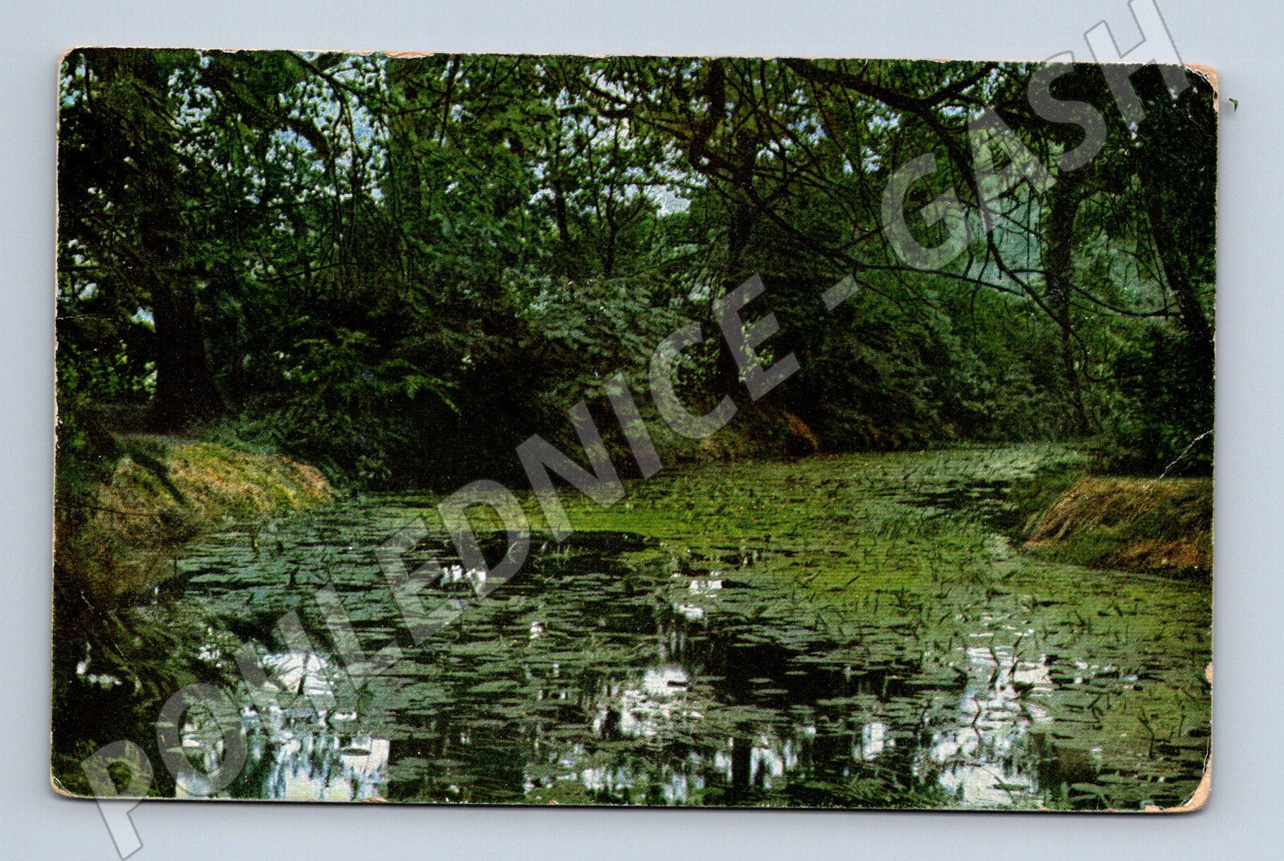 Originální stará pohlednice menšího formátu z období před rokem 1950. Na přední straně je barevná fotografie lesního jezírka s lekníny v malebné krajině, obklopené vzrostlými stromy. Pohlednice je popsána a odeslaná, s ručně psaným textem v němčině i v češtině na zadní straně. Sbírkový stav, mírné opotřebení v rozích, jinak velmi pěkně zachovalá. Vhodné pro sběratele starých pohlednic, dokumentující dobovou krajinu a způsob korespondence.