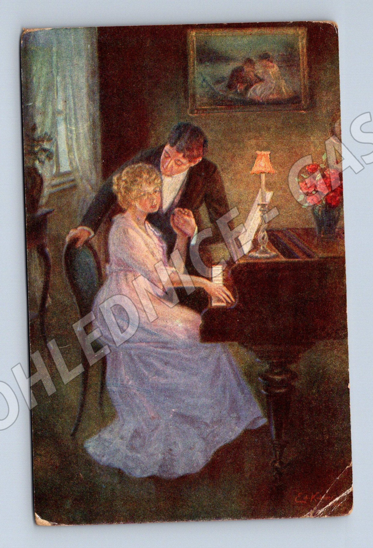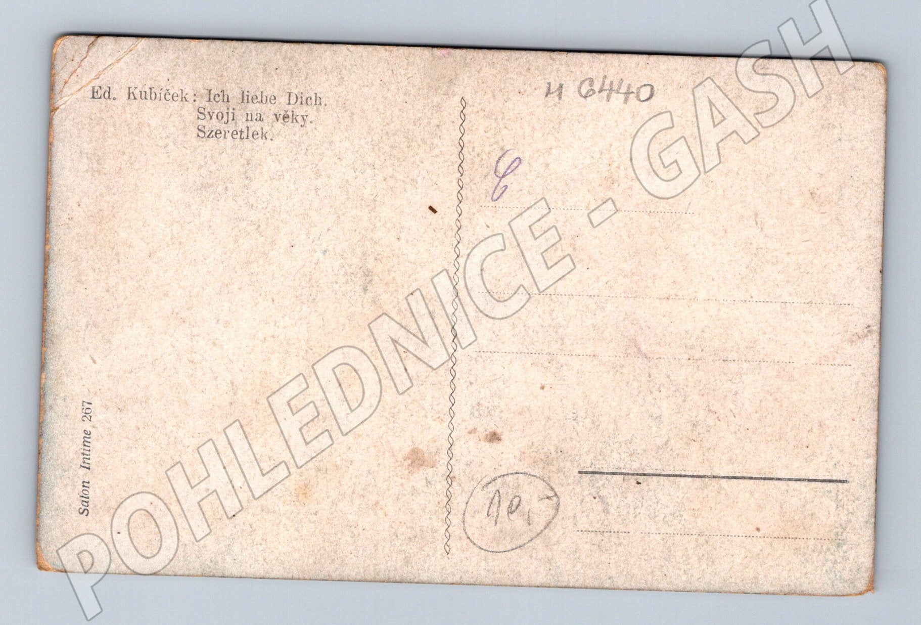 Starší pohlednice s romantickým motivem – zamilovaný pár v interiéru pokoje, v intimní atmosféře u stolu s květinami a lampou. Na zadní straně je vícejazyčný nápis „Ich liebe Dich / Svoji na věky / Szeretlek“ (Miluji tě / Navždy svoji) a označení vydavatele Ed. Kubíček, číslo série Schan Intime 267. Pohlednice nese lehké známky stáří – rohy jsou místy ošoupané a okraje mírně opotřebované. Formát klasické historické pohlednice, cca první polovina 20. století. Bez známky a razítka, psaná pouze sběratelsky. Skvělý přírůstek do sbírky romantických pohlednic nebo tématu láska a vztahy.
