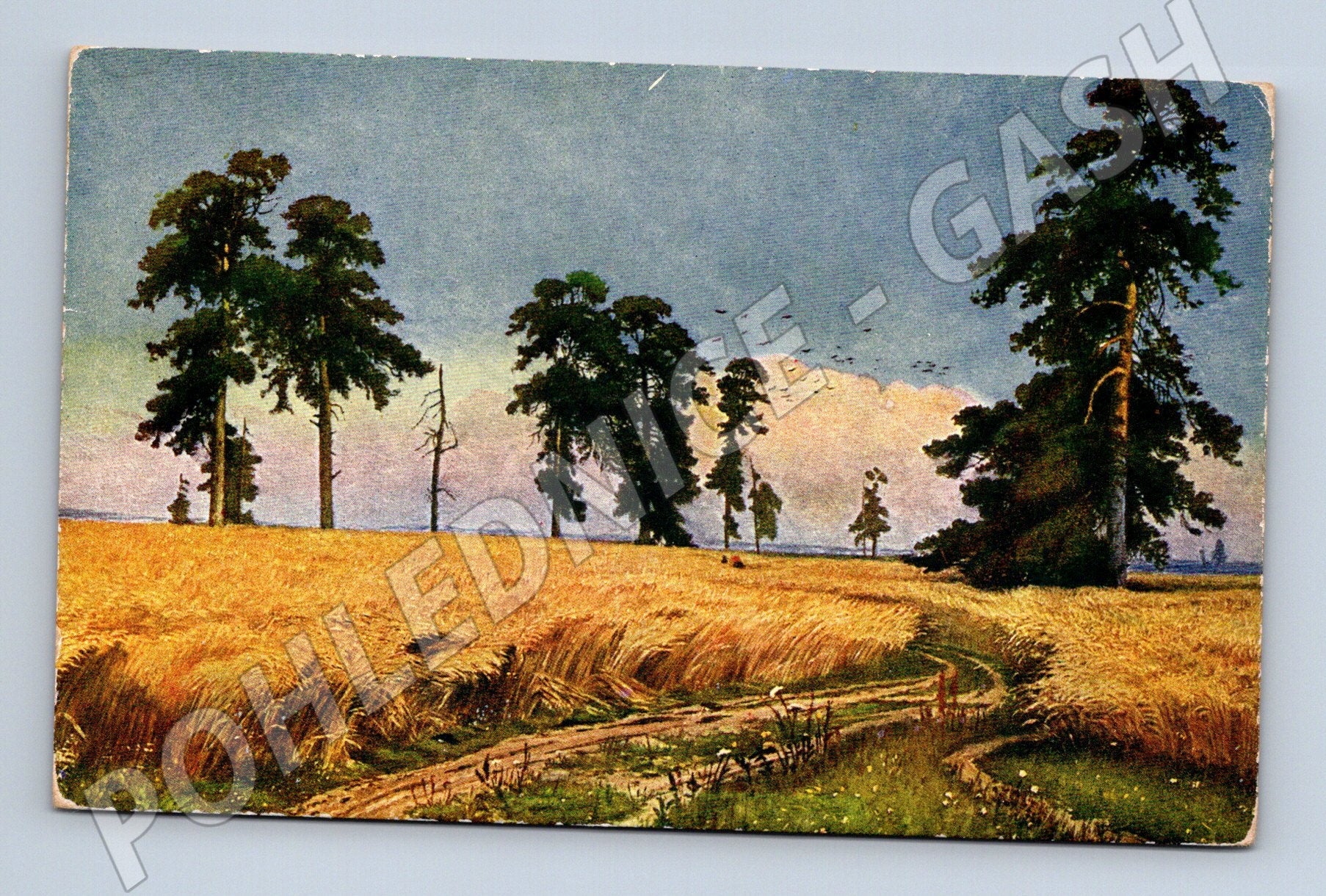 Nabízím originální starou pohlednici s reprodukcí malířského díla. Pohlednice zobrazuje romantickou krajinomalbu – zlaté obilné pole s několika vysokými stromy pod modrou oblohou, po které letí hejno ptáků. V popředí se vine přírodní cesta, která přirozeně vede mezi klasy a stromy do dáli. Na zadní straně je klasické rozvržení pro poštovní údaje, pohlednice nebyla dosud použita. Stav: odpovídá stáří, mírně ohnuté rohy, barvy jsou stále živé. Skvělý doplněk do sbírky pohlednic či oblíbený motiv pro milovníky krajinomalby.
