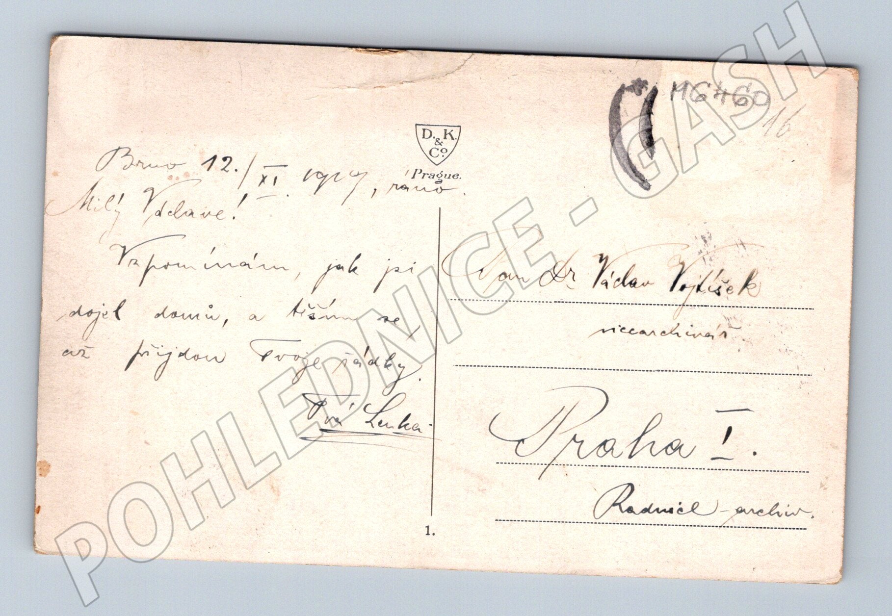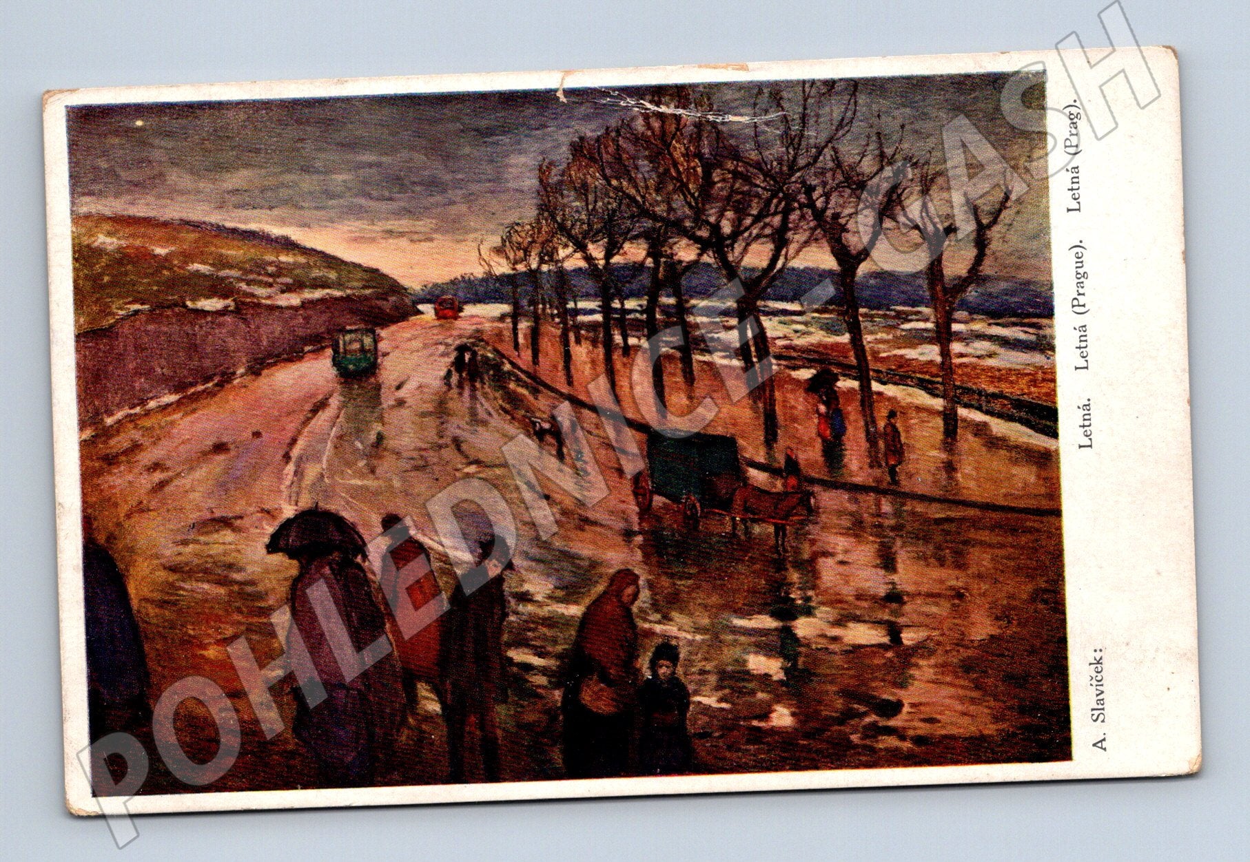 Pohlednice s motivem Letné v Praze podle obrazu významného českého malíře Antonína Slavíčka. Pohlednice zachycuje romantickou atmosféru Letenské pláně v podzimním nebo zimním období – na obrazu jsou postavy procházející se v dešti či mlze, vozy na cestě, staré stromy a pohled na řeku. Jedná se o uměleckou pohlednici s krásnou barevností a melancholickou náladou, detailně propracovanou malířskou technikou. Na zadní straně je ručně psaná zpráva a známky poštovního použití. Skvělý sběratelský kus pro milovníky Prahy, české malby i starých pohlednic.
