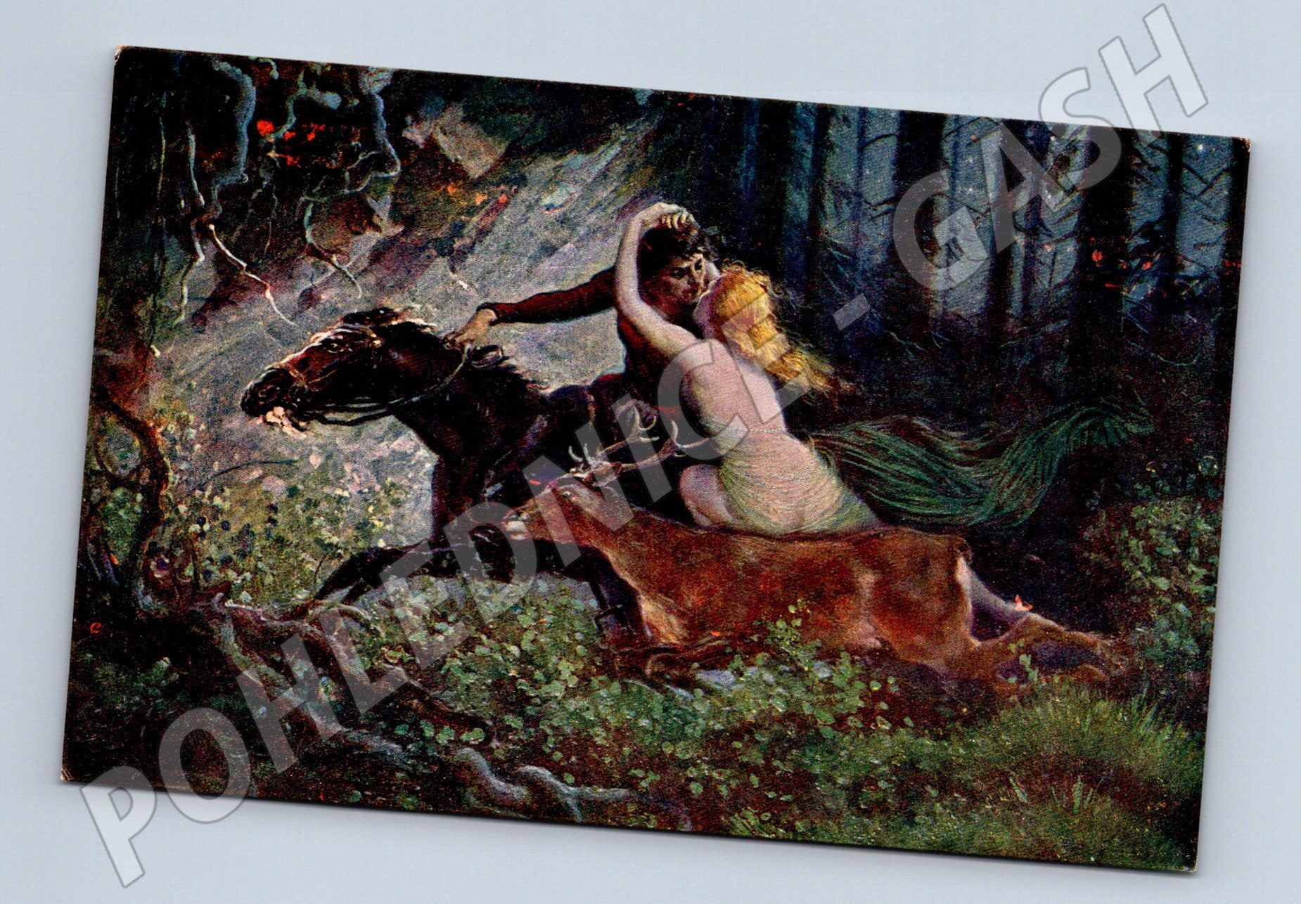Umělecká stará pohlednice s motivem Lesní žínka od Adolfa Liebschera. Pohlednice zachycuje dramatickou scénu v temném lese, kde na koni jede muž a za ním se vine lesní nymfa s dlouhými vlasy. Originální malba zachycuje napětí a pohádkovou atmosféru lesa, typickou pro tvorbu tohoto autora. Na zadní straně nápis v několika jazycích (Lesní žínka, Waldnymphe, Nimphe de la forêt, Lesna kobieta), vydavatel Salon Prague. Stav pohlednice viz foto, bez známky použití, vhodná do sbírky.