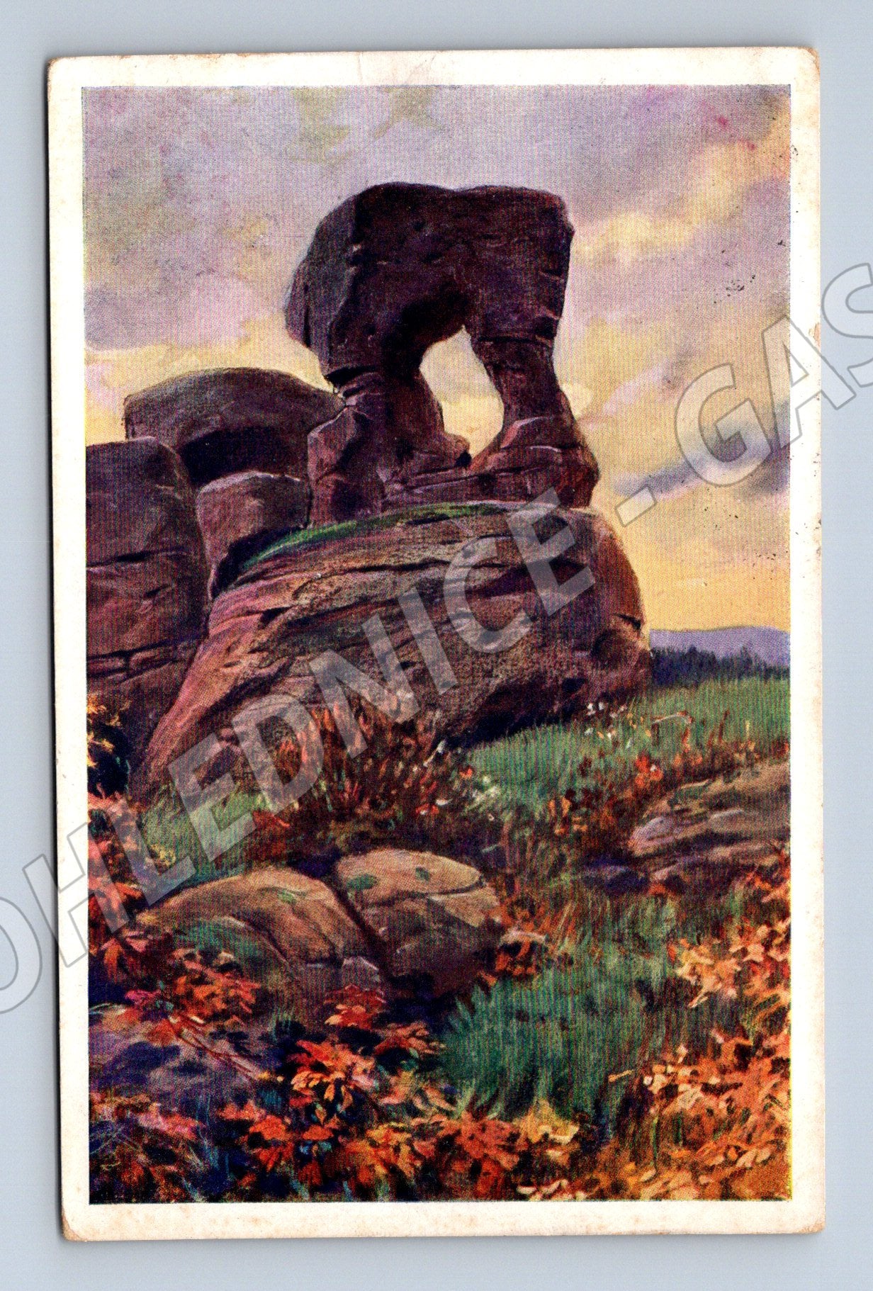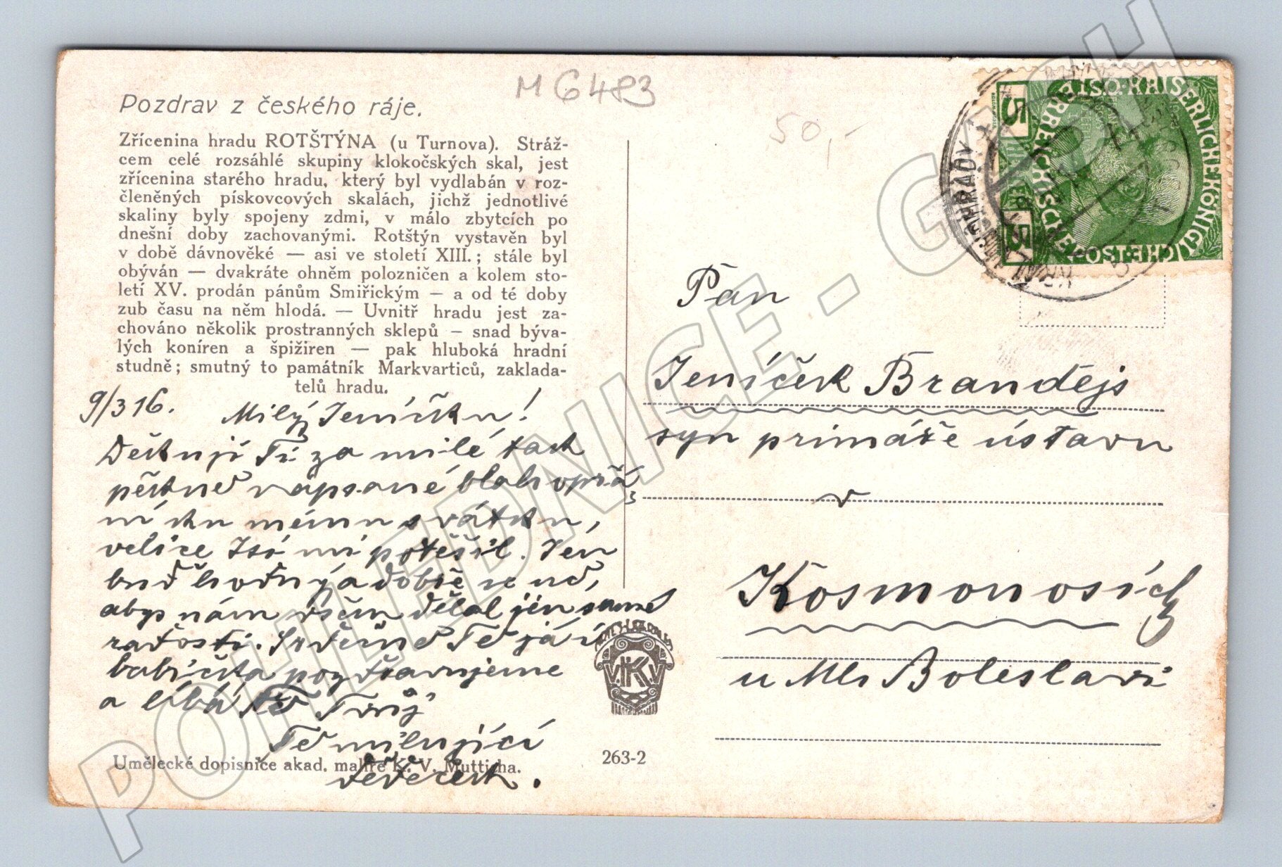 Originální umělecká pohlednice zobrazující zříceninu hradu Rotštejn (Turnov), který se nachází v Českém ráji. Na přední straně je malovaný motiv pískovcových skal, zbytků zdí a okolní podzimní přírody. Zadní strana obsahuje tištěný historický popis této památky, použitou poštovní známku z období Rakouska-Uherska a ručně psaný text z roku 1936. Pohlednice nese znaky stáří, ale je ve sběratelsky atraktivním stavu. Skvělý doplněk do kolekce historických pohlednic s tématikou hradů a zámků.